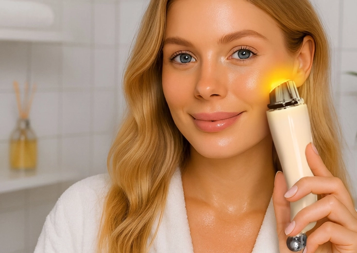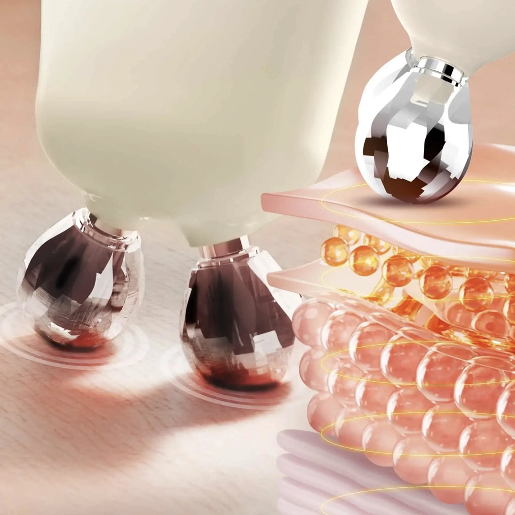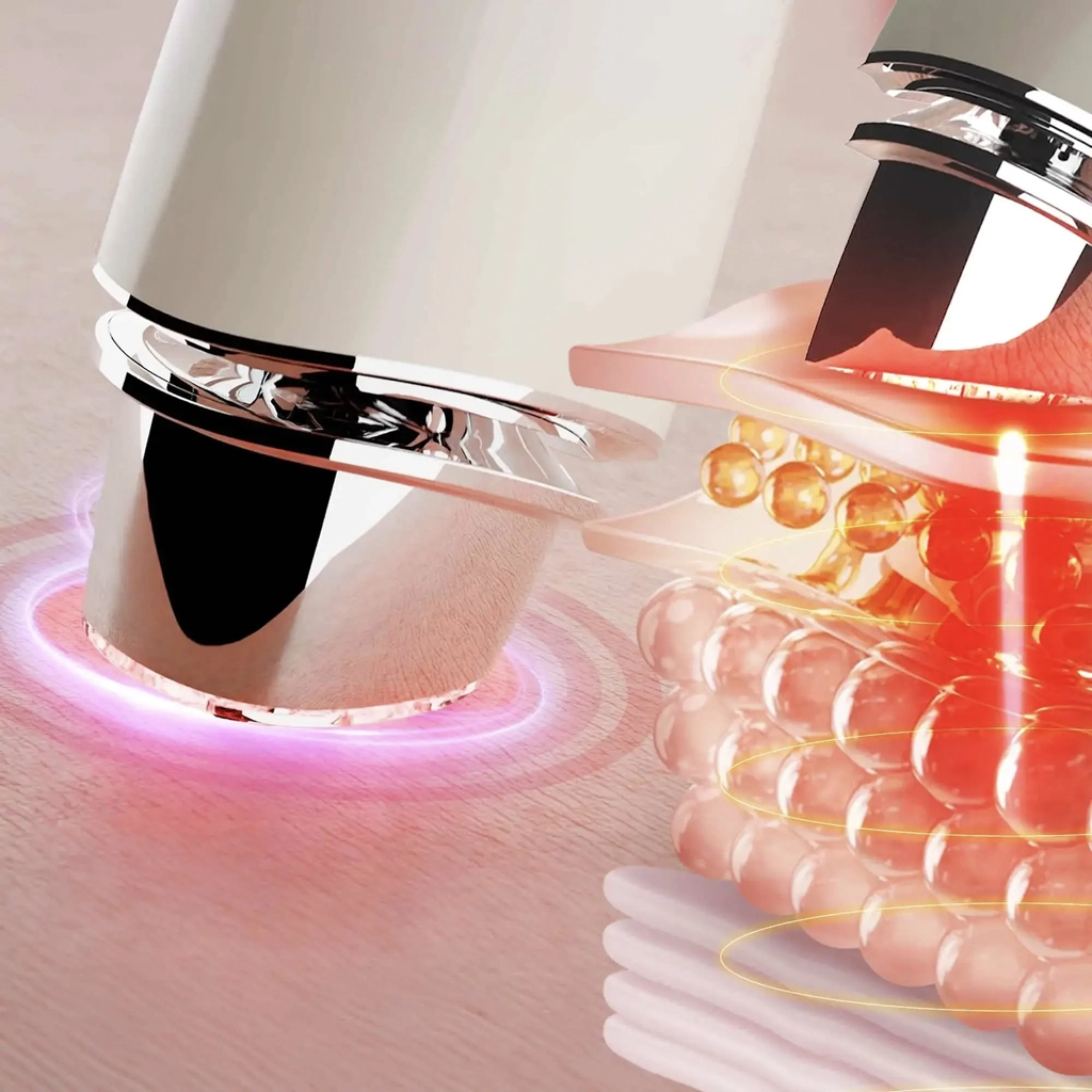 Dijamantni masažni vrhovi za precizno oblikovanje linija i ravna glavica s osam točaka za posvjetljivanje, umirivanje i potporu mikrocirkulaciji pomoću svjetla i vibracija.