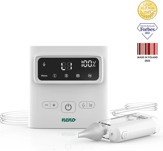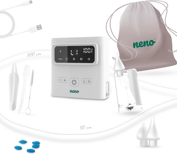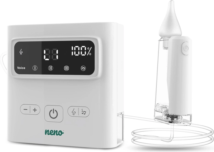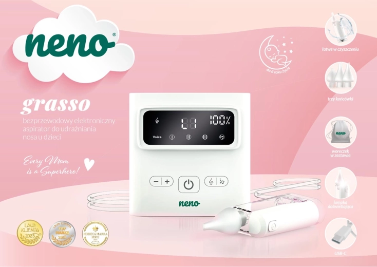 Bežični aspirator za nos Neno Grasso nježno i učinkovito oslobađa začepljen nos beba i djece do 6 godina. Nudi do 9 razina usisa, tehnologiju Active Airflow za nježno usisavanje bez iritacije, 3 silikonska nastavka za različite dobne faze te umirujuće melodije i bijeli šum za mirno čišćenje. Zahvaljujući USB‑C punjenju, bežičnom radu i LED osvjetljenju idealan je kod kuće i na putu.