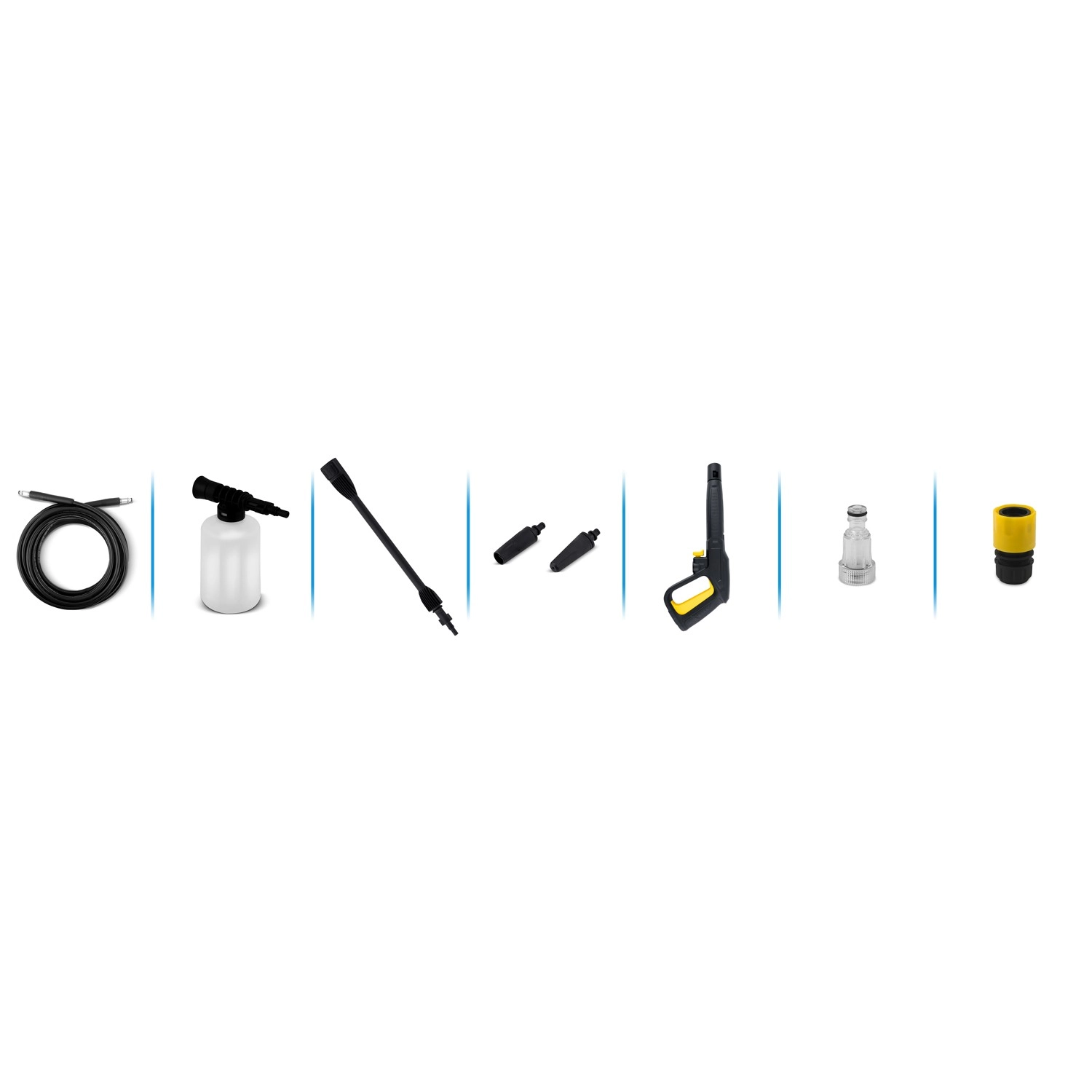 podesiva dizna, turbodizna TurboStream, visokotlačno crijevo 6 m, brza spojka i priključak za vodu, boca za deterdžent 450 ml s regulacijom, igla za čišćenje, napojni kabel 5 m, integrirani vodeni filtar