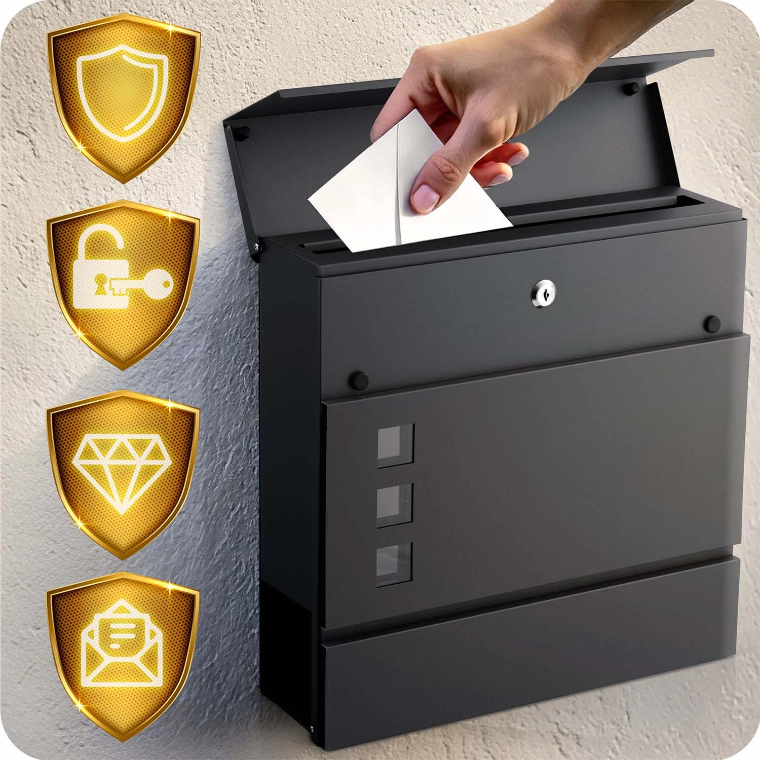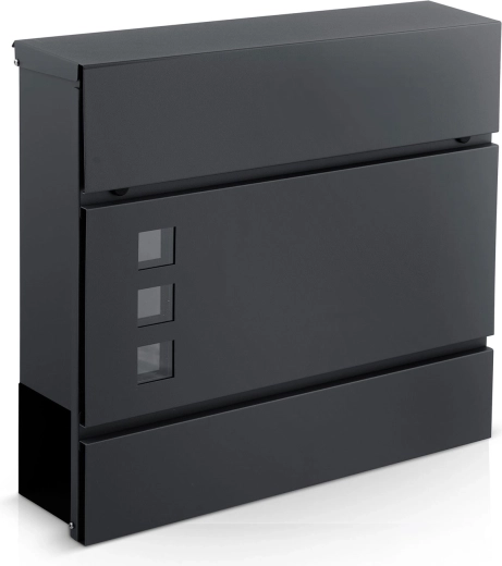 Moderan poštanski sandučić od pocinčanog čelika s držačem za novine u elegantnoj antracit boji osigurava sigurno pohranjivanje pošte i novina. Zahvaljujući prašnatom lakiranju otporan je na vremenske uvjete, ima tihi, amortizirani gornji otvor, prozorić za provjeru sadržaja i sigurnu bravu s dva ključa. Jednostavna montaža zahvaljujući priloženom setu tiplova i vijaka.