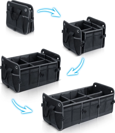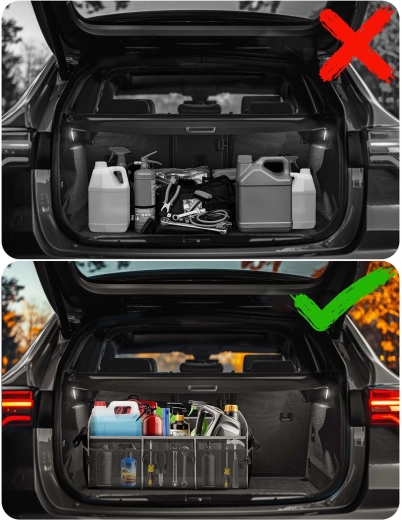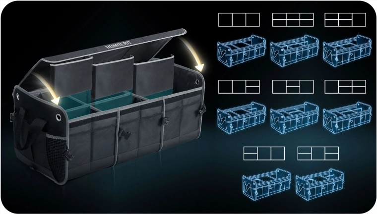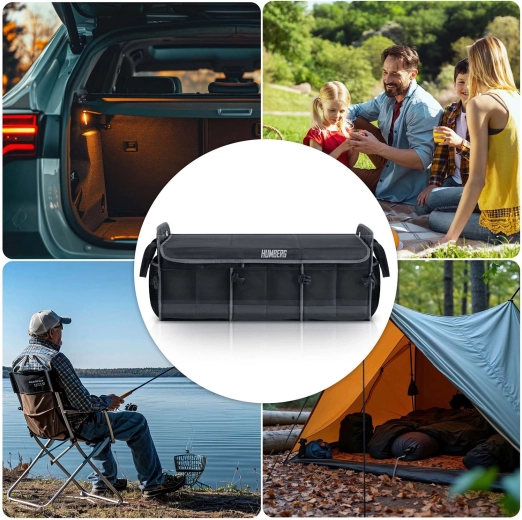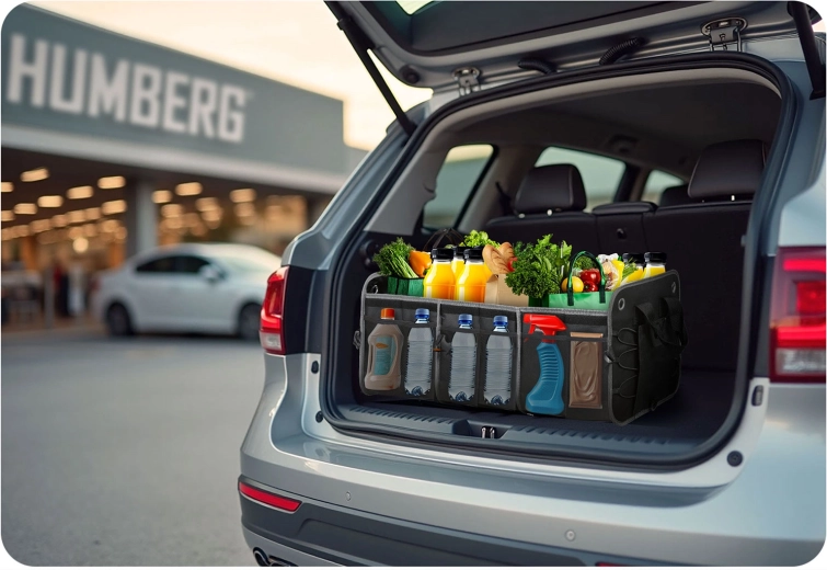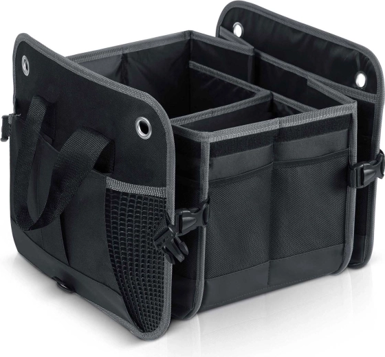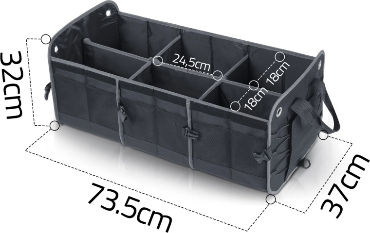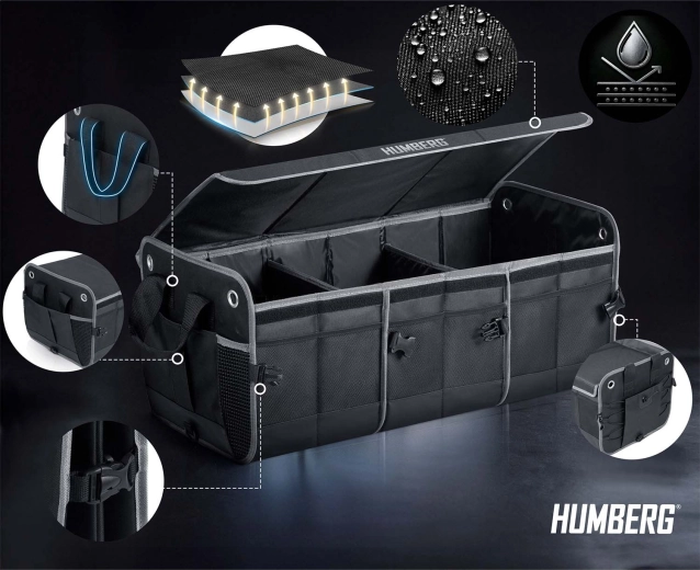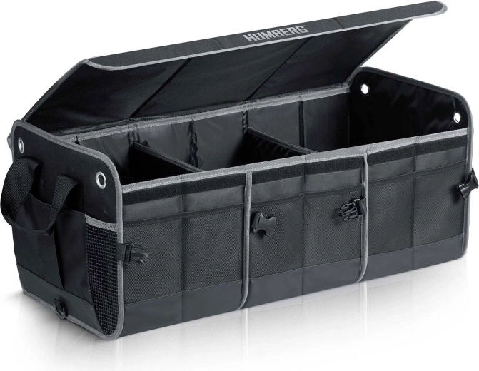 Pretvorite kaos u preglednost. Organizator prtljažnika HUMBERG osmišljen je za vozače, kurire i obitelji – čuva kupovinu, alat, kabele i prvu pomoć sigurno posložene i lako dostupne. Sklopiva konstrukcija omogućuje korištenje od jedne do više komora, čvrste stijenke drže oblik, a odvojivi poklopac štiti sadržaj od prašine i znatiželjnih pogleda.
