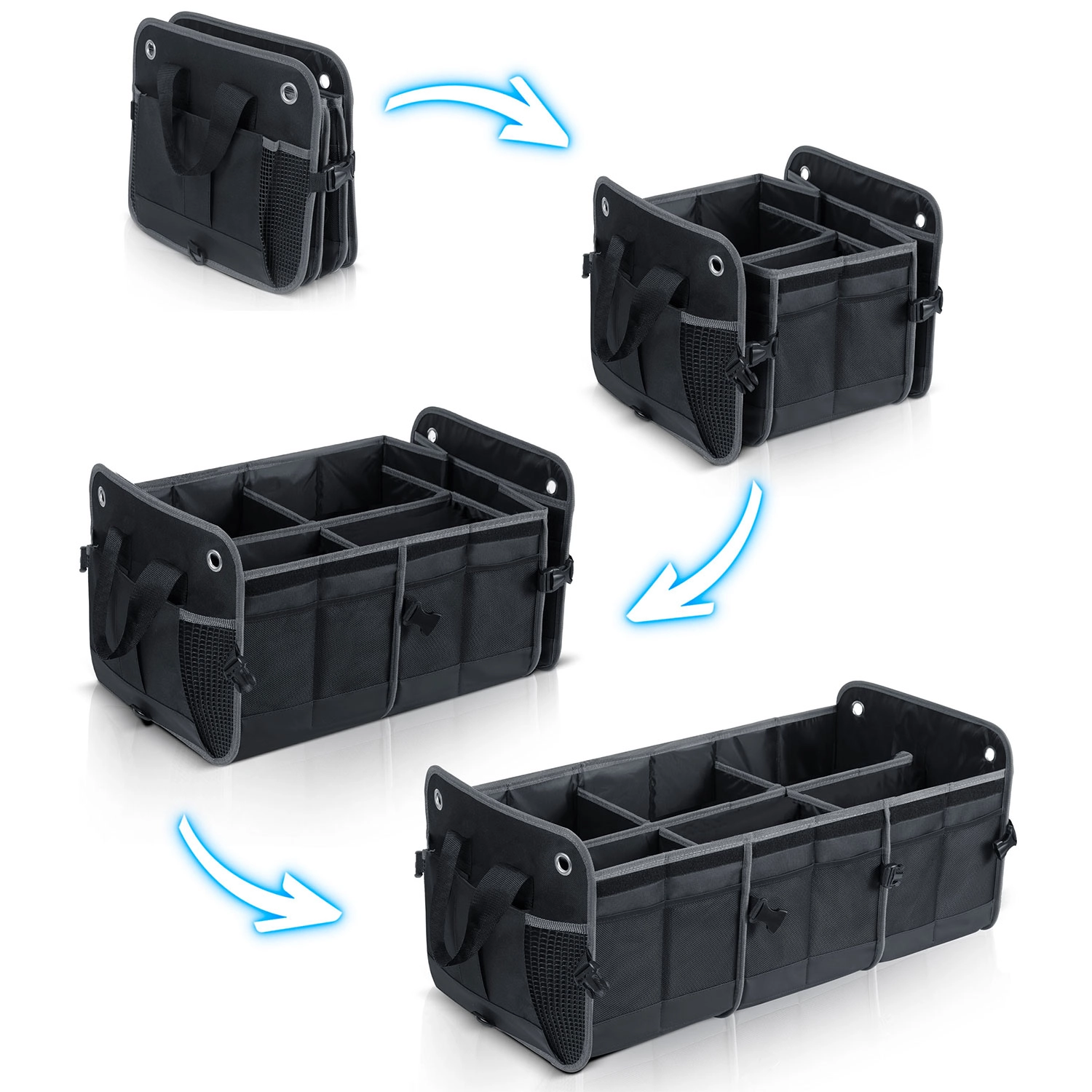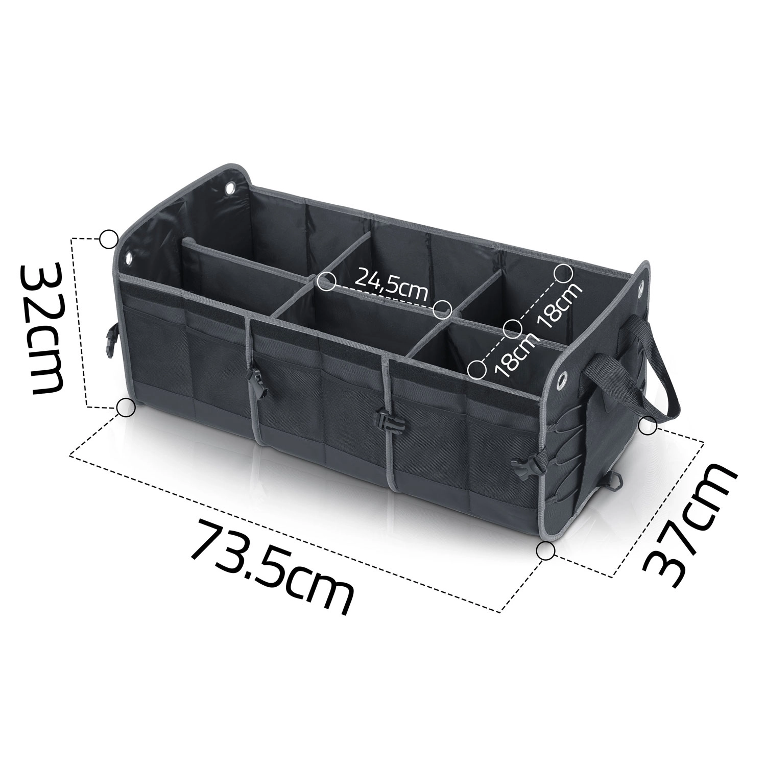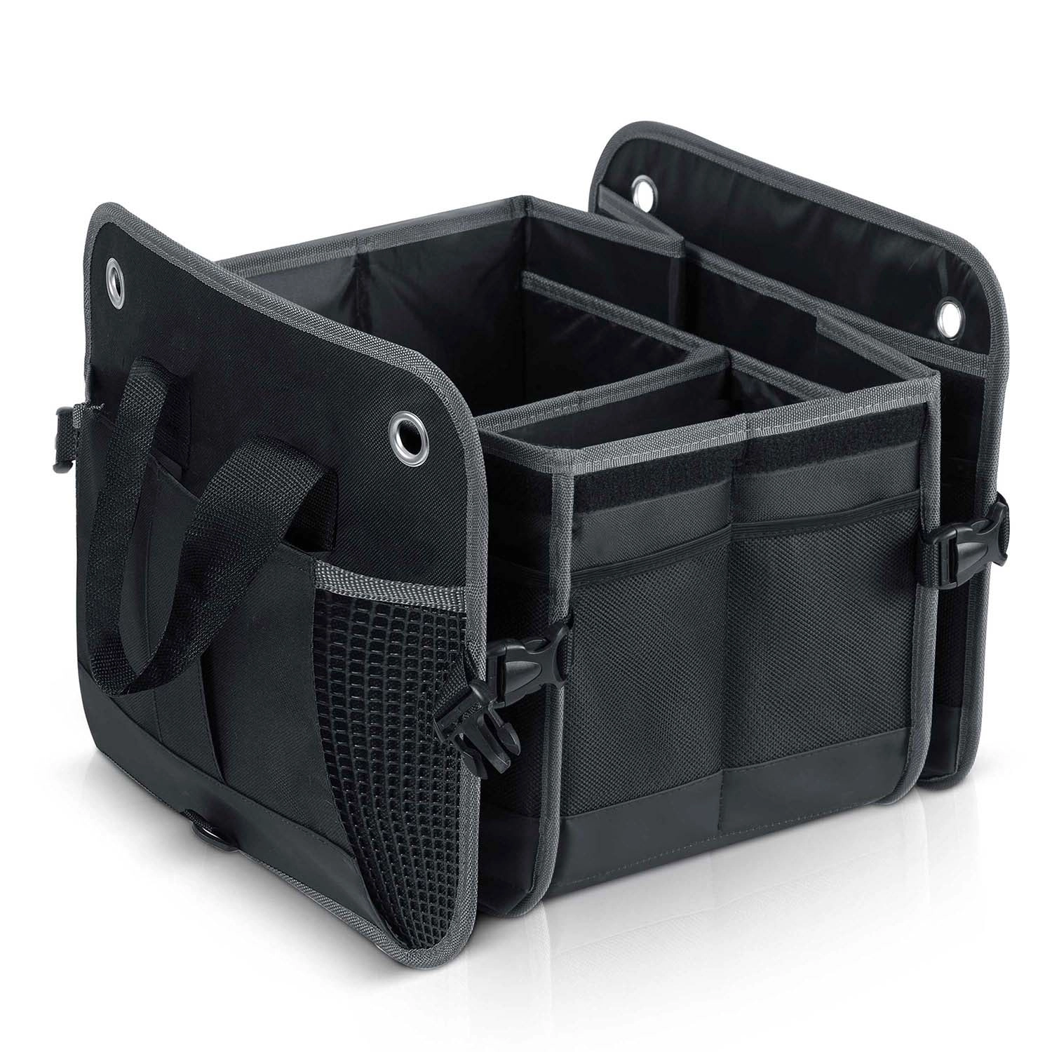 Pretvorite kaos u preglednost. Organizator prtljažnika HUMBERG osmišljen je za vozače, kurire i obitelji – čuva kupovinu, alat, kabele i prvu pomoć sigurno posložene i lako dostupne. Sklopiva konstrukcija omogućuje korištenje od jedne do više komora, čvrste stijenke drže oblik, a odvojivi poklopac štiti sadržaj od prašine i znatiželjnih pogleda.