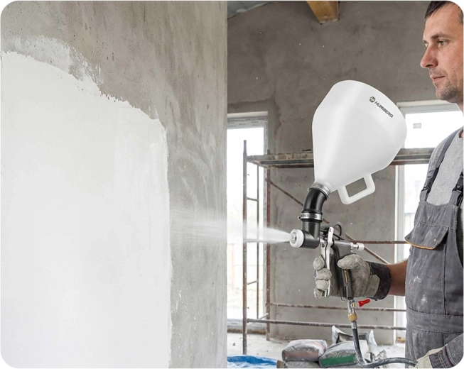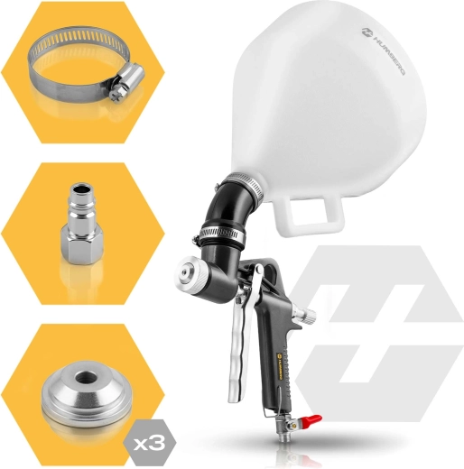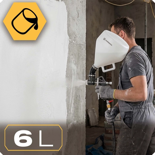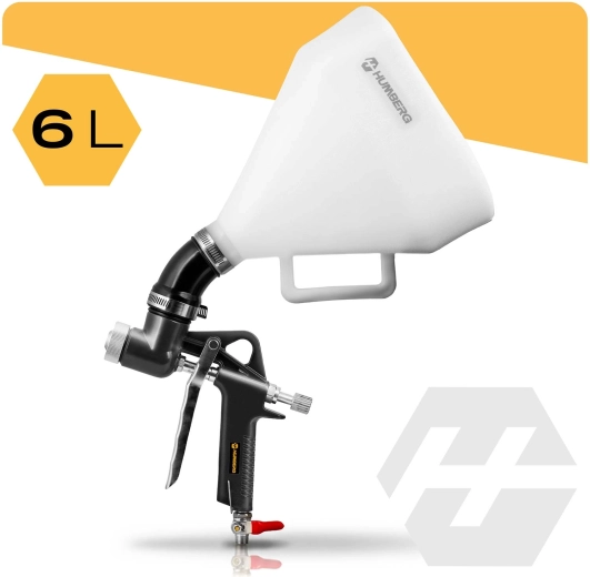 Pneumatski pištolj HUMBERG univerzalni je alat za nanošenje tankoslojnih i strukturiranih žbuka, glet masa i dekorativnih smjesa. Zahvaljujući velikom spremniku od 6 l radite neprekidno bez čestog nadopunjavanja, dok izbor među 3 izmjenjive mlaznice omogućuje precizno prilagođavanje protoka gustoći materijala i željenom efektu.