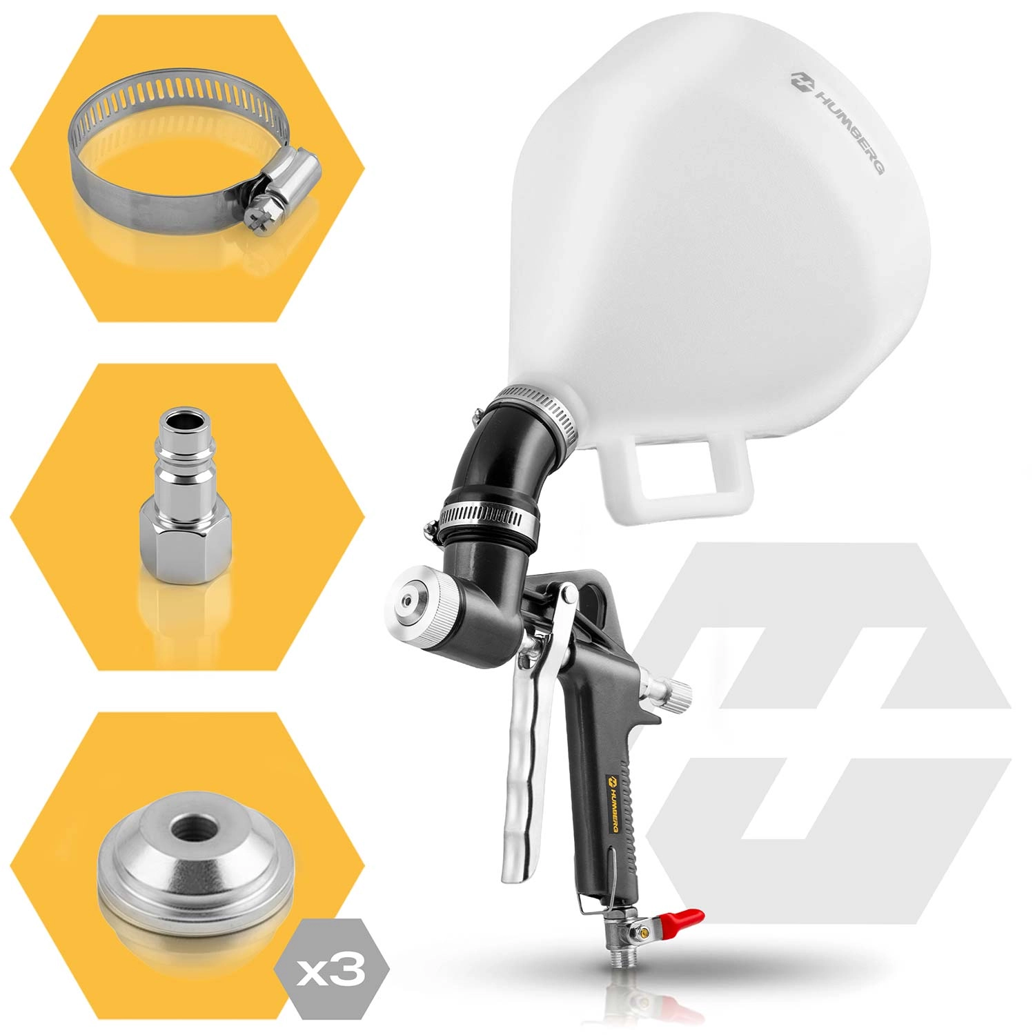 Snažan pneumatski pištolj za prskanje HUMBERG s spremnikom od 6 l namijenjen je brzoj i ravnomjernoj aplikaciji žbuka i dekorativnih struktura. U kompletu su 3 mlaznice 4/6/8 mm za različite gustoće materijala, brza spojka 1/4" i sigurnosni/pritezni prsten za sigurno korištenje. Uštedite vrijeme i troškove i postignite rezultate kao profesionalac.