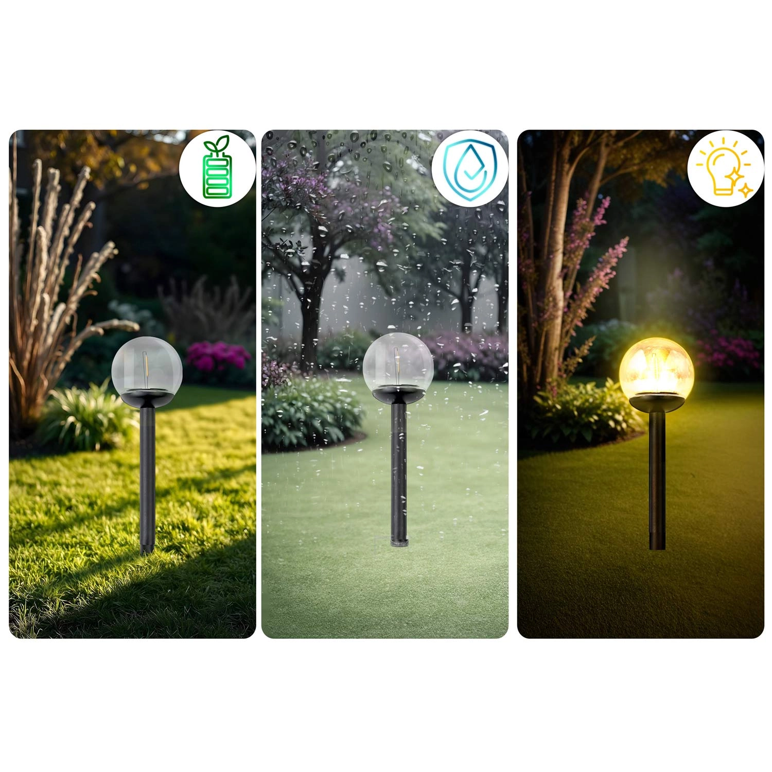 Pretvorite vrt u čarobnu oazu s kompletom od četiri solarne svjetiljke s kuglastom glavom. Zahvaljujući LED žaruljama s filamentom, amorfim solarnim panelima i automatskom noćnom aktivacijom dobit ćete ugodno osvjetljenje staza, gredica i travnjaka bez kabela i bez brige.