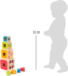 Svaka je kocka ukrašena veselim motivima životinja i izraženim bojama koje potiču na otkrivanje. Precizni otvori vode djecu ka strpljenju i koncentraciji, a slaganje tornja podržava stabilnost ruke i prostornu maštu. Kvalitetan drveni materijal ugodan je na dodir i izdržljiv za svakodnevnu igru.