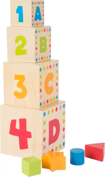 Svaka kocka nudi otvore za umetanje oblika te tisak sa slovima i brojevima – idealno za prvo prepoznavanje, razvrstavanje i slaganje u ispravan redoslijed.