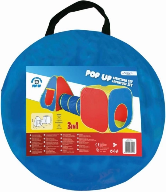 Zabavni pop-up set šatora 3 u 1 pretvara sobu ili vrt u dječje igralište. Sadrži kockasti šator, tunel i pop-up šator koji se mogu koristiti zajedno ili odvojeno. Brzo postavljanje bez napora, lagana konstrukcija i jednostavno odlaganje osiguravaju udobnu igru kod kuće i na otvorenom.