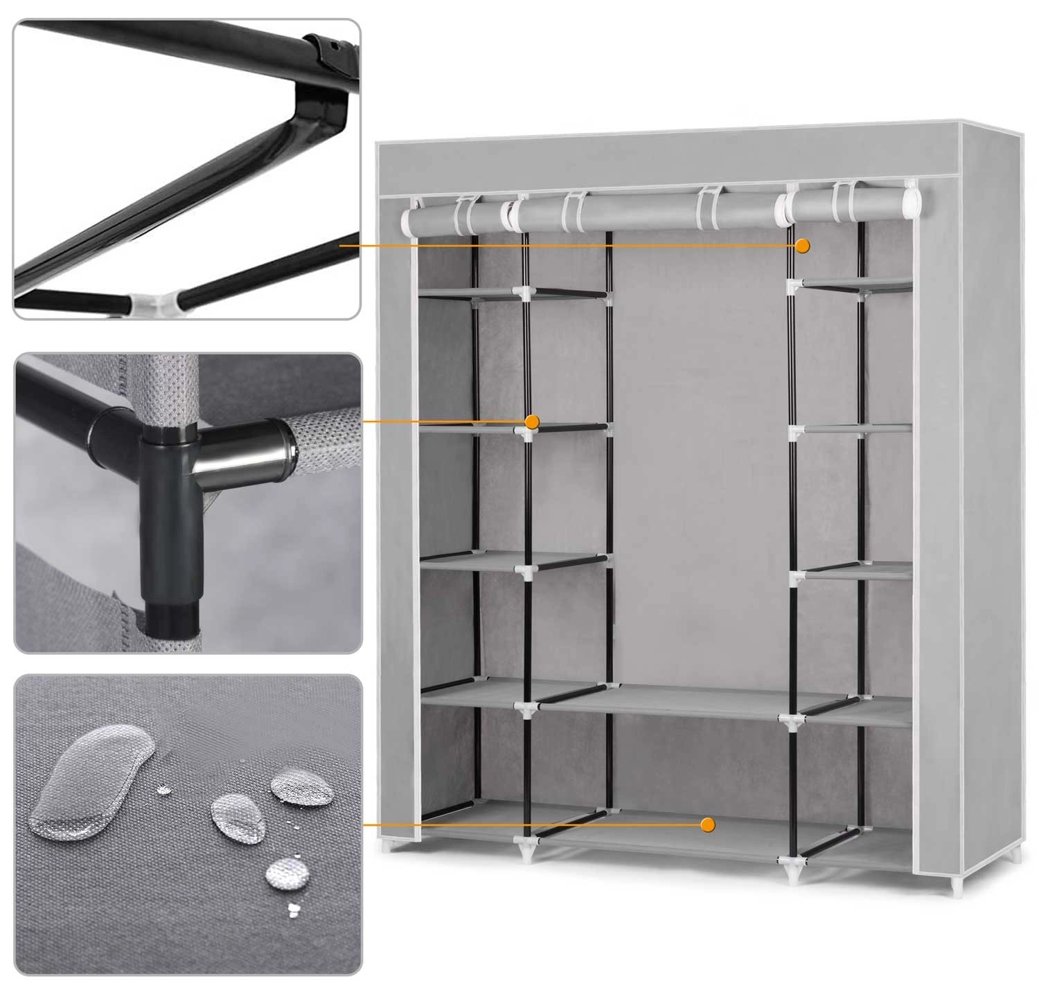 Tekstilni ormar Massido – siva idealno je rješenje za spavaće sobe, garderobe, predsoblje i studentske sobe. Izdržljiv čelični okvir s čvrstim PP spojnicama i vodootporna presvlaka osiguravaju dugi vijek trajanja i pri svakodnevnoj upotrebi. Zahvaljujući promišljenom rasporedu polica i vješalice, lako ćete pospremiti odjeću, dodatke i obuću.