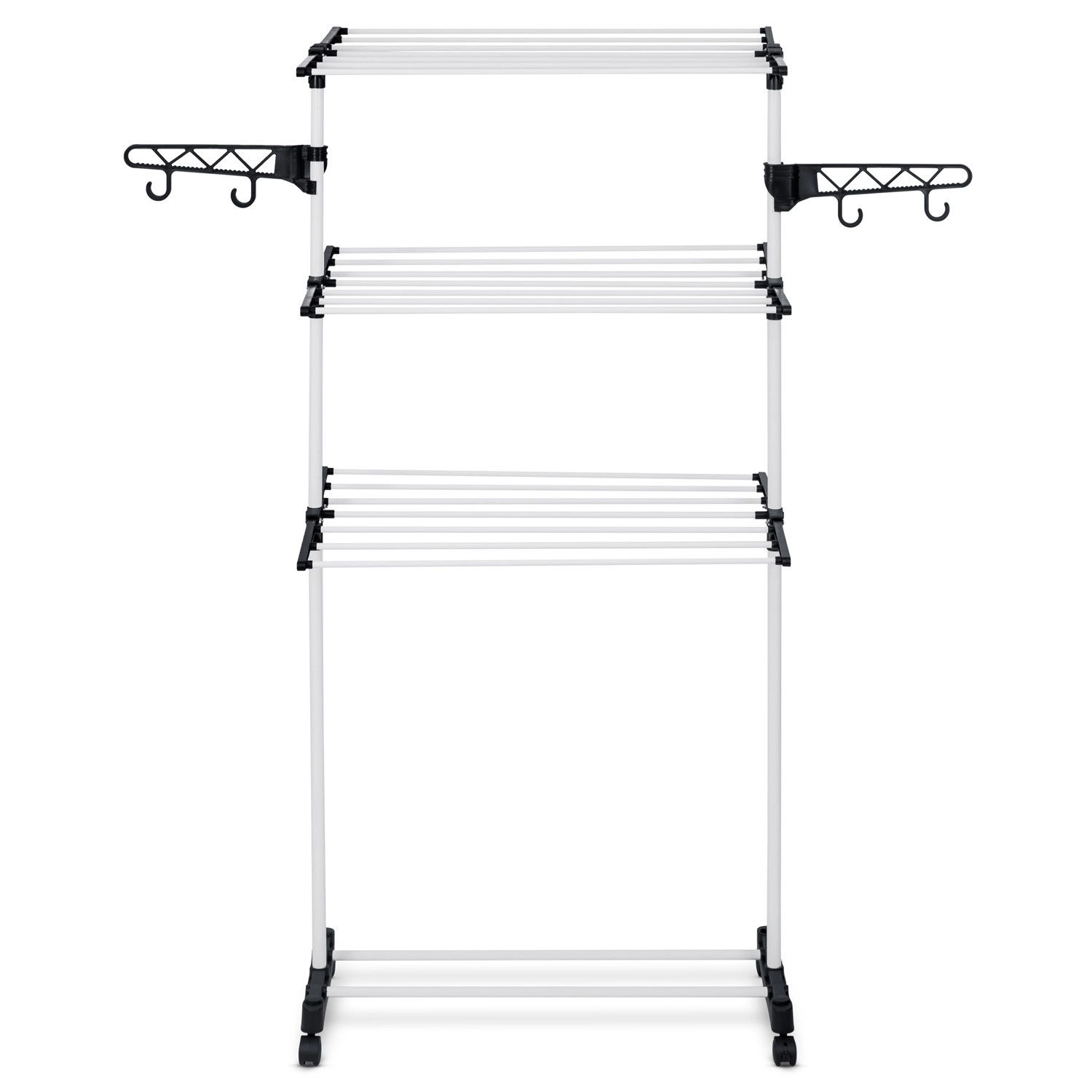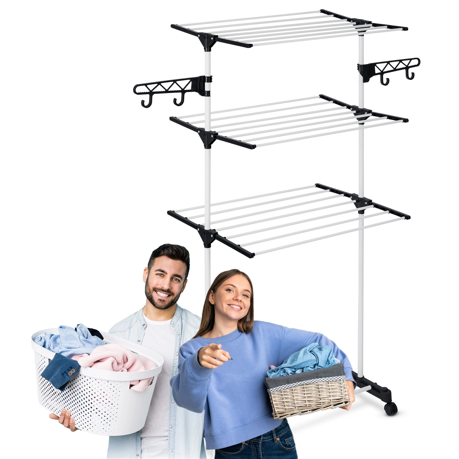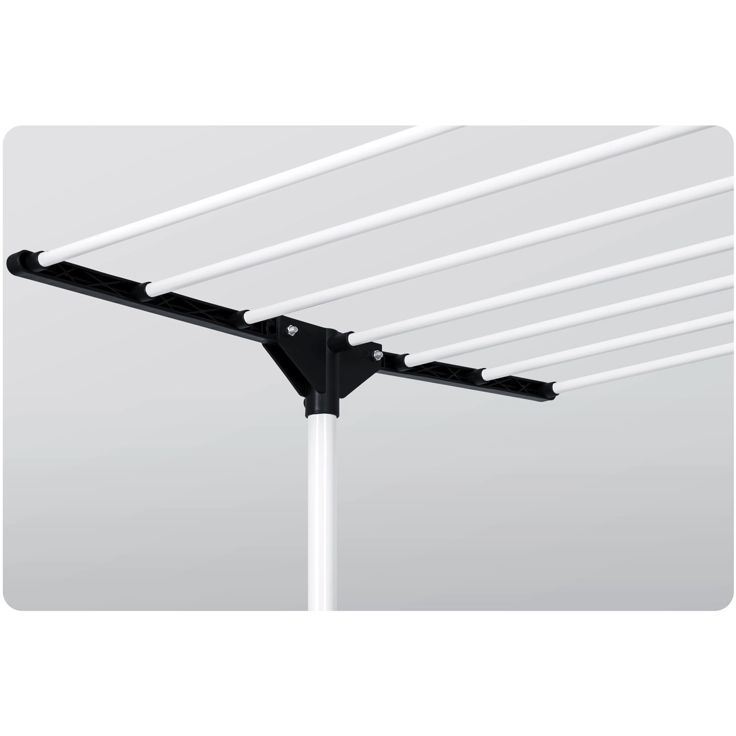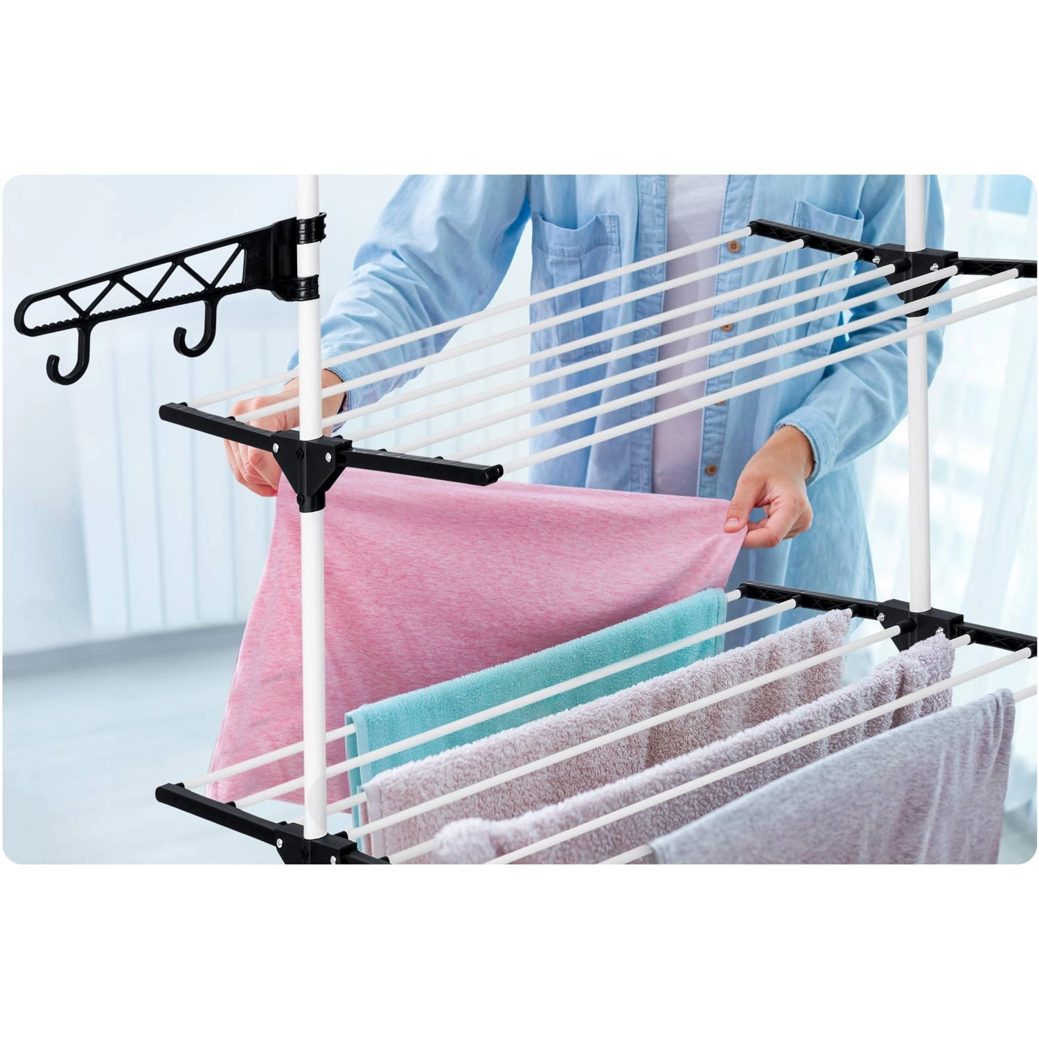 Šest sklopivih razina nudi fleksibilno sušenje od majica do ručnika. Šire prečke smanjuju nastanak nabora pa peglanje često nije potrebno. Praktične bočne kukice i otvori za vješalice i sitno rublje štede mjesto na glavnim razinama. Zahvaljujući promišljenim razmacima između šipki zrak slobodno struji, a rublje se suši brzo i ravnomjerno.