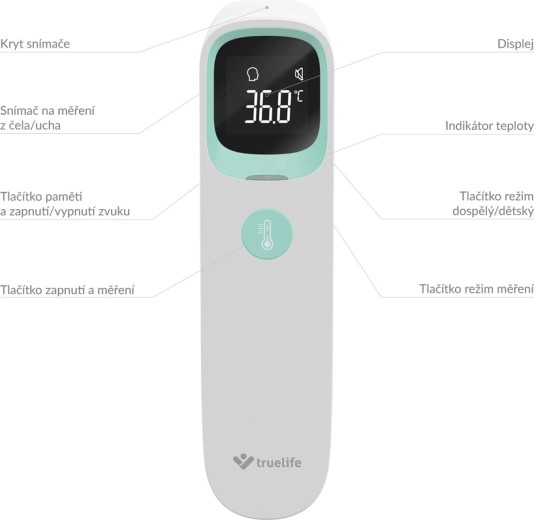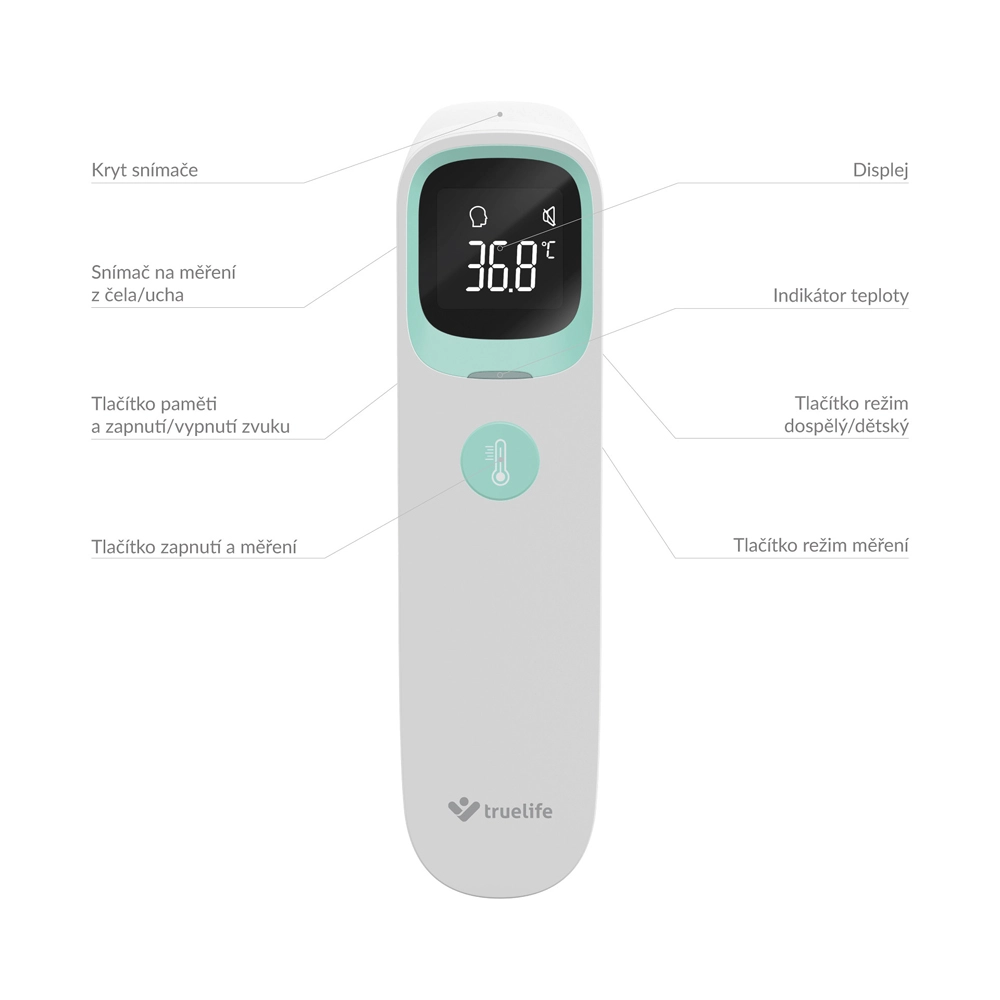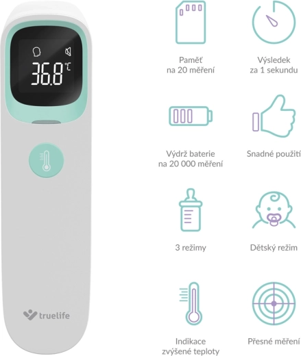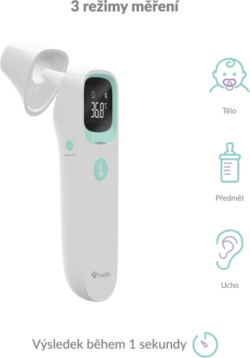 TRUELIFE Care Q9 je moderan beskontaktni infracrveni toplomjer koji mjeri temperaturu u 1 sekundi s visokom točnošću. Zahvaljujući trima načinima rada mjeri tjelesnu temperaturu s čela i iz uha, kao i temperaturu predmeta i tekućina – idealno za dječje mlijeko, kupku ili napitke. Obojeni indikator na zaslonu odmah upozorava na povišenu temperaturu, i to i u mraku.