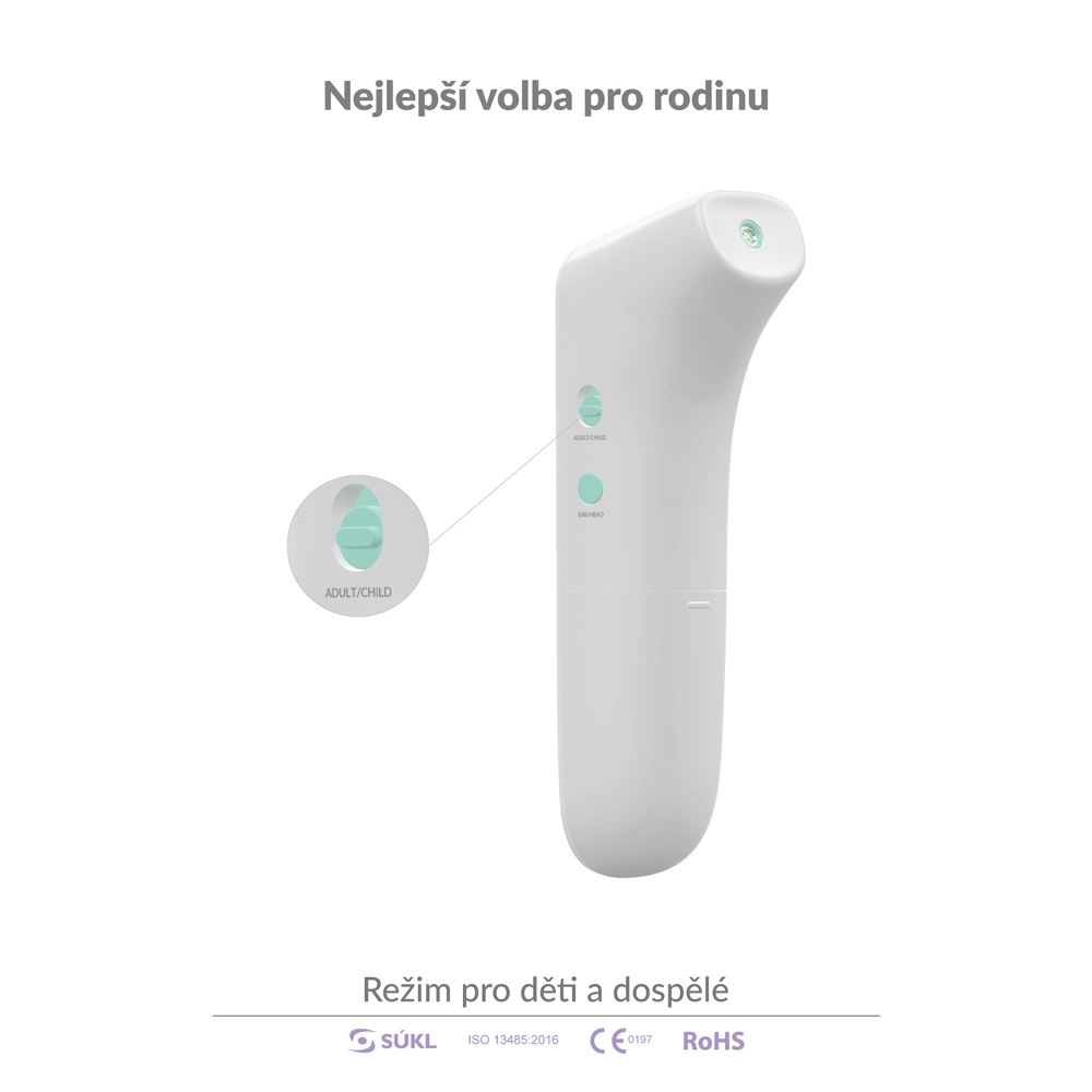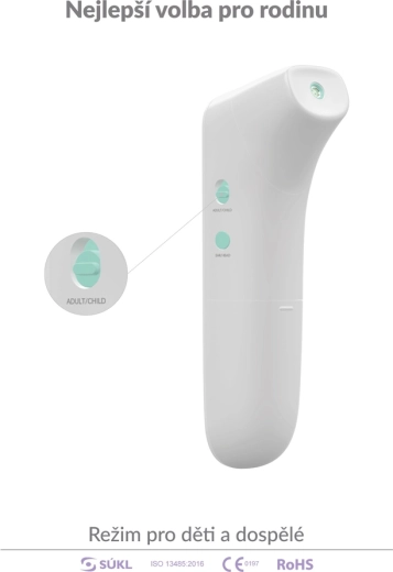 Za obitelji s djecom tu je dječji način za osobe mlađe od 12 godina. Mjerenje je potpuno higijensko i udobno – dovoljno je usmjeriti s udaljenosti 1–3 cm i pritisnuti jedini gumb. Toplomjer pamti posljednjih 20 vrijednosti, a zahvaljujući štedljivom radu ostvaruje do 20 000 mjerenja na jedan set baterija.