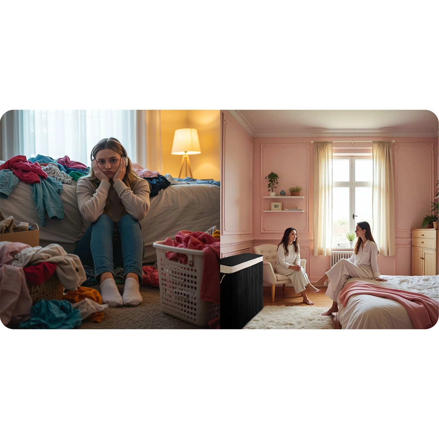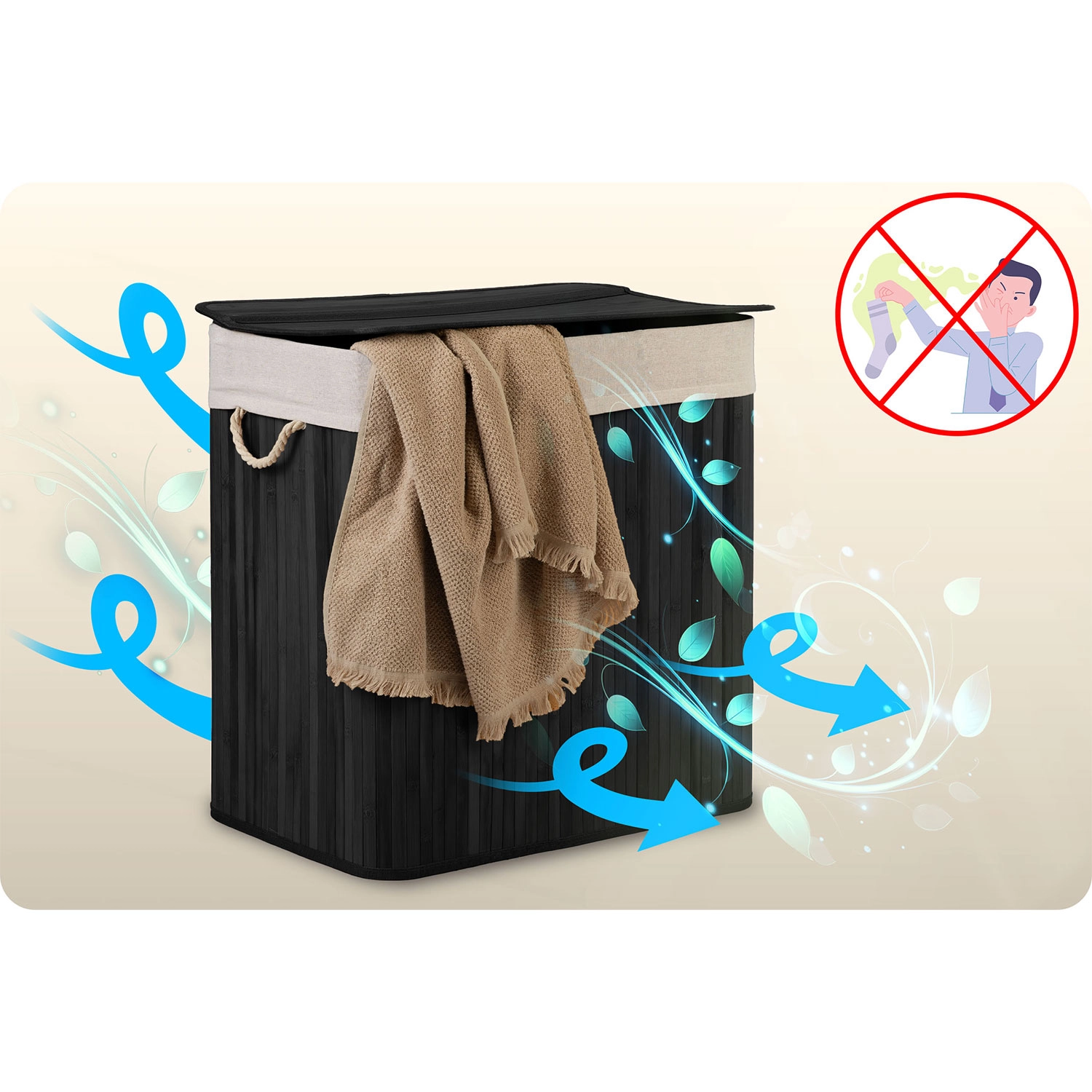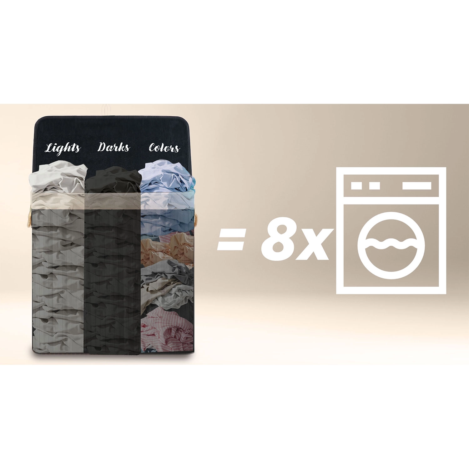 Otkrijte praktično rješenje za svakodnevno razvrstavanje rublja. Velikodušna zapremina 150 litara primi rublje iz više pranja, dok pregledne oznake Lights / Darks / Colors uklanjaju dugotrajno razvrstavanje prije pranja. Prirodni materijali – bambus i pamuk – podržavaju cirkulaciju zraka i smanjuju neugodne mirise.