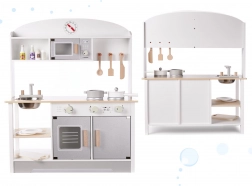 Stilna drvena dječja kuhinjica od MDF-a u neutralnim bojama donosi sate kreativne igre. Ima metalni, iznimljivo praktičan odvojivi sudoper, ploče za kuhanje s okretnim gumbima, pećnicu s prozorčićem i zaslonom, mikrovalnu pećnicu te ocjeđivač za posuđe. U kompletu je bogat drveni pribor (lonac, tava, tanjurići, nožić, žlica, lopatica, posudice za začine) i praktične kukice i police za odlaganje. Sigurno, glatko brušeno i obojano netoksičnim bojama.