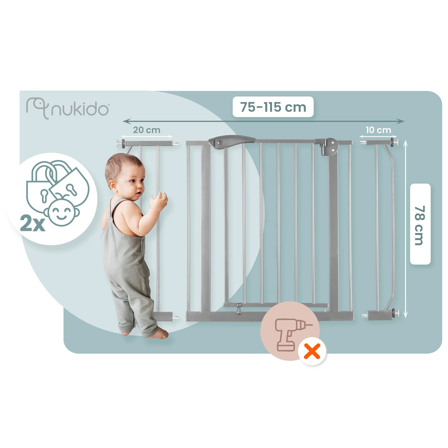 Sigurnosna brava NUKIDO u neutralnoj sivoj boji zahvaljujući metalnoj konstrukciji odlično se uklapa u moderne interijere. Ugradnja se vrši tlačno – bez bušenja, pa ne oštećuje zidove ni dovratnike. Pakiranje sadrži dva produžetka (10 cm i 20 cm) i 4 regulatora širine, zahvaljujući kojima ćete bravu lako prilagoditi prolazima od 75 do 115 cm.