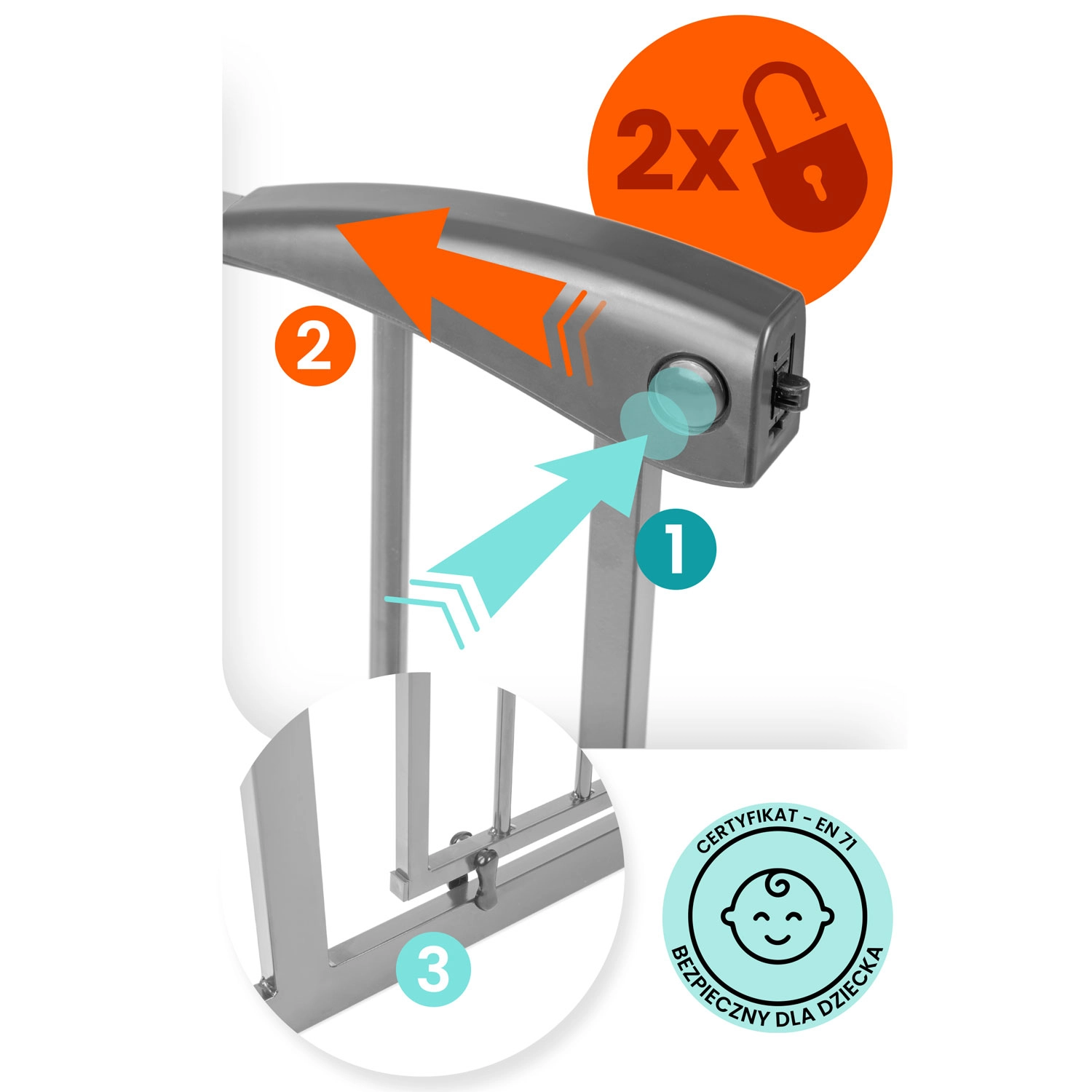 • Sigurnost na prvom mjestu – dvostruko zaključavanje, mogućnost jednostrane blokade, norme EN1930:2011 i EN71.