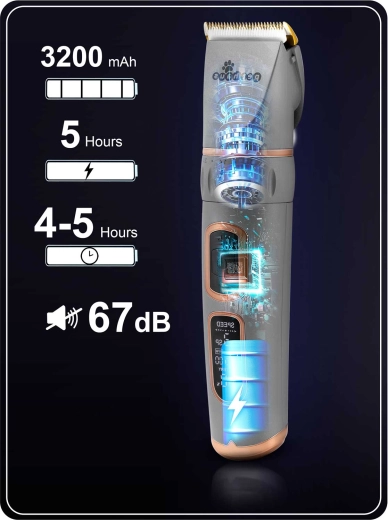 Zahvaljujući Li‑Ion bateriji 3200 mAh radi do 5 sati s jednim punjenjem, a preko USB‑C priključka potpuno se napuni približno za 5 sati. Podešavanje duljine 0,8–2,0 mm izravno na uređaju i četiri češljeva nastavka (3, 6, 9 i 12 mm) omogućuju precizno prilagođavanje tipu krzna i željenom stilu.