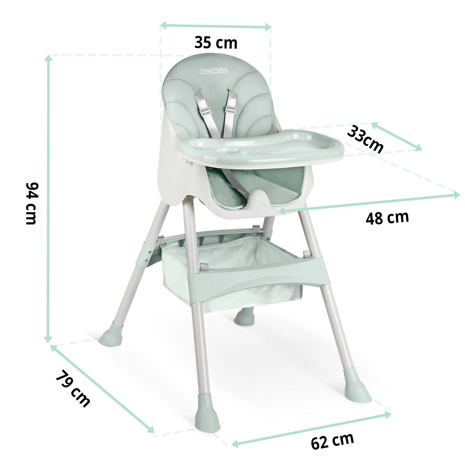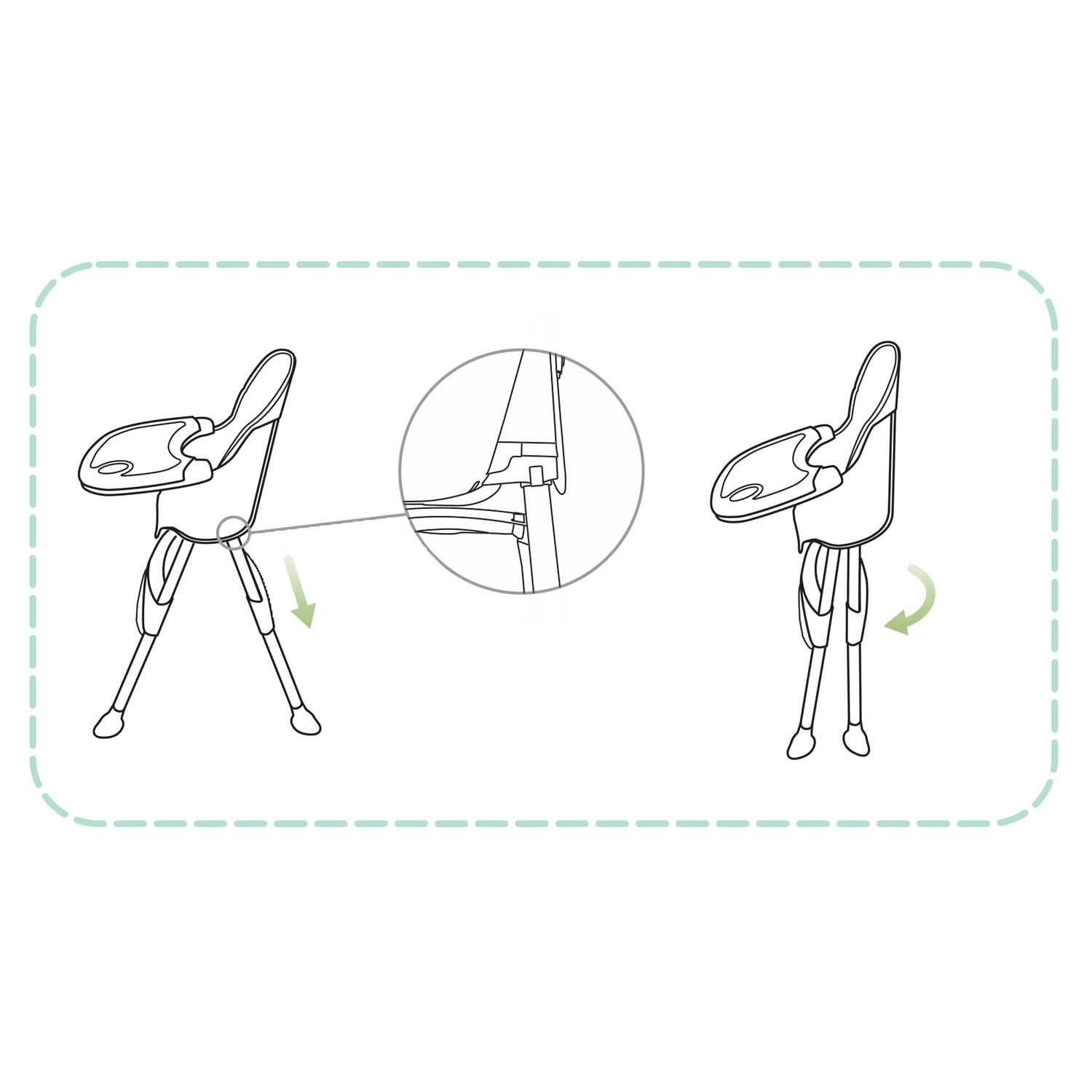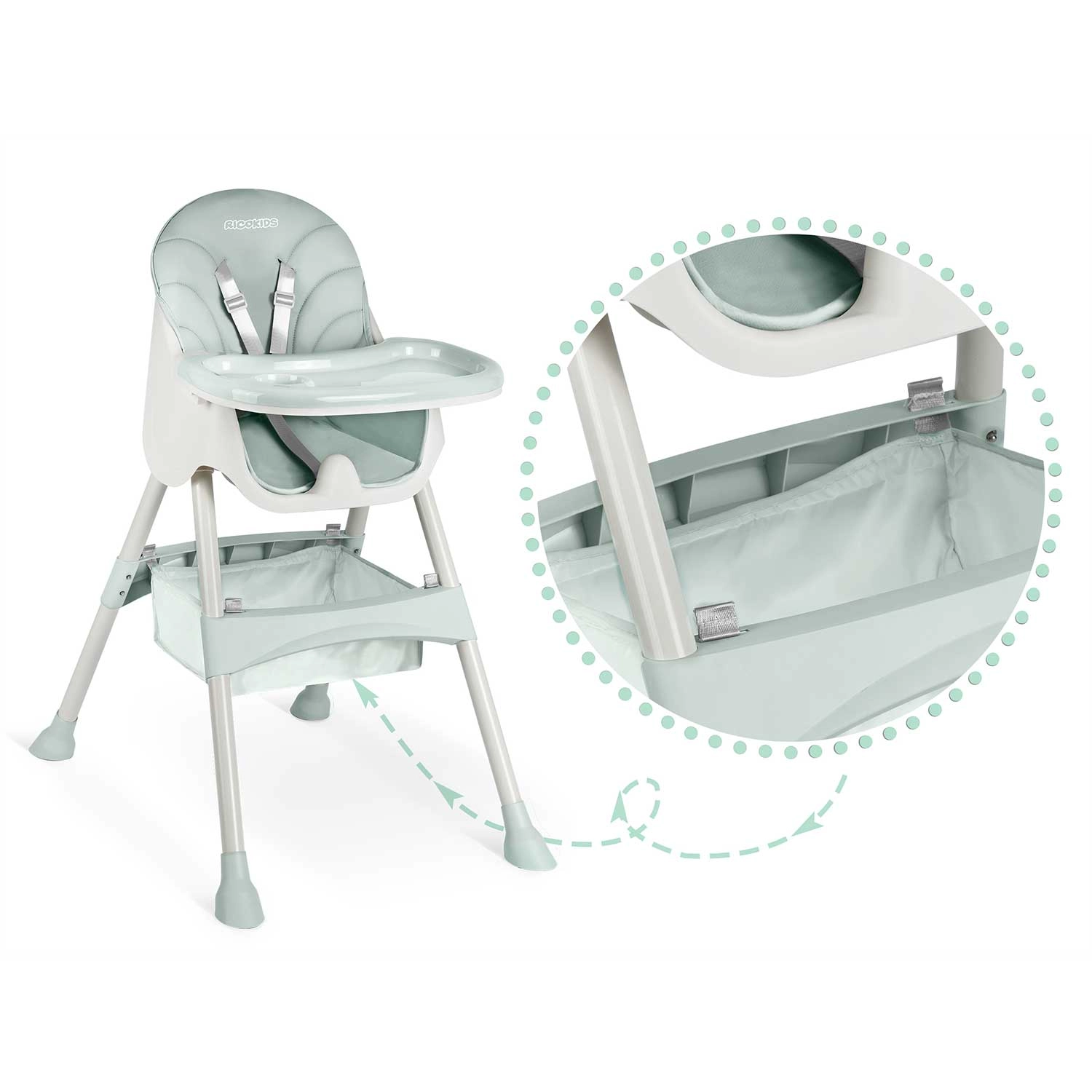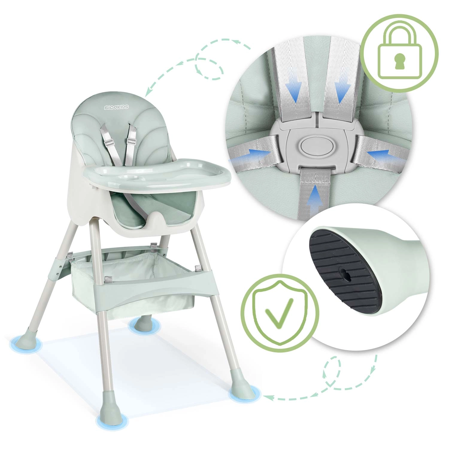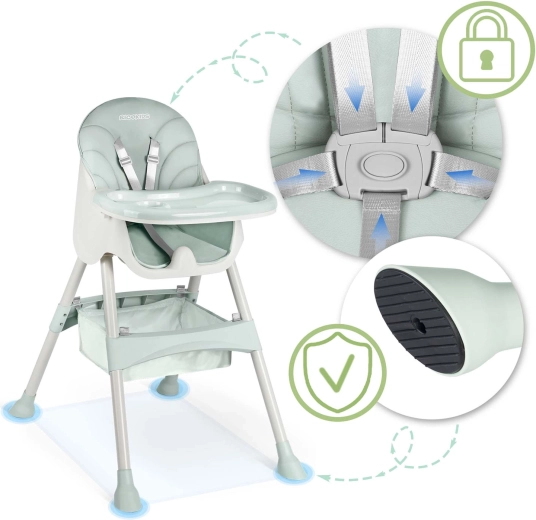 Sigurnost osiguravaju pojas u 5 točaka i protuklizne nožice koje drže hranilicu stabilnom na svakoj podlozi. Sklopiva konstrukcija štedi prostor – sklopite je u trenu i lako pohranite. U pakiranju je i praktična košarica za igračke i sitnice kako bi vam sve potrebno bilo pri ruci.