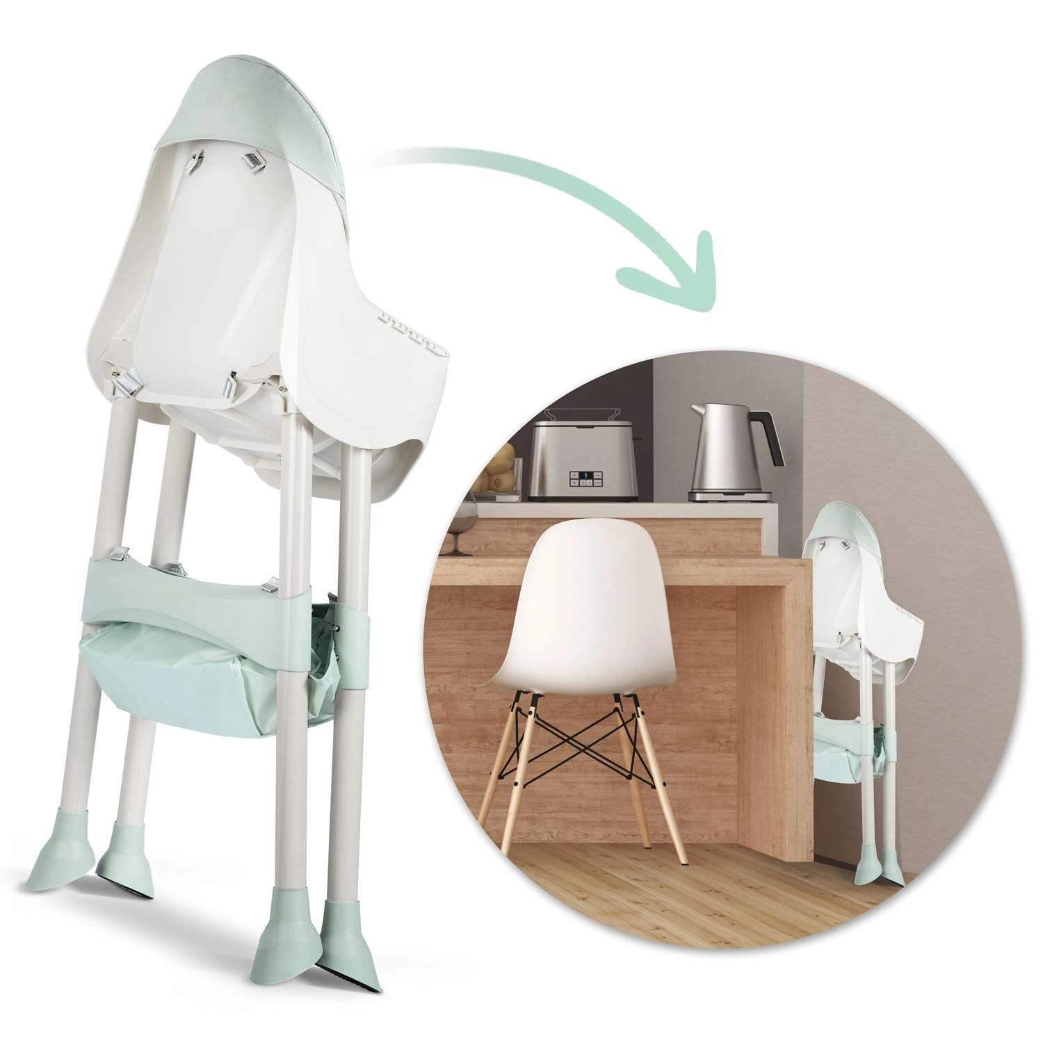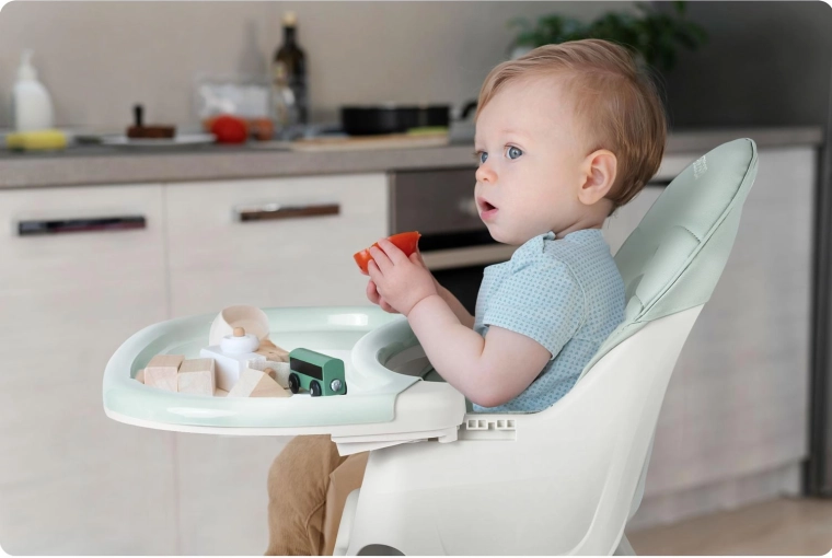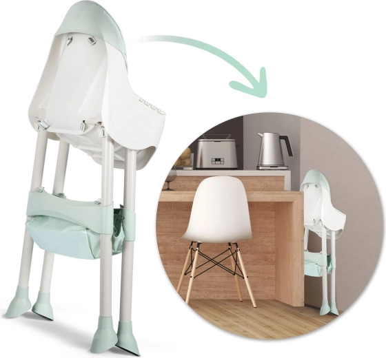 Visoka hranilica za hranjenje, nisko sjedalo i booster – jednim klikom mijenjate konfiguraciju prema dobi i potrebama djeteta.