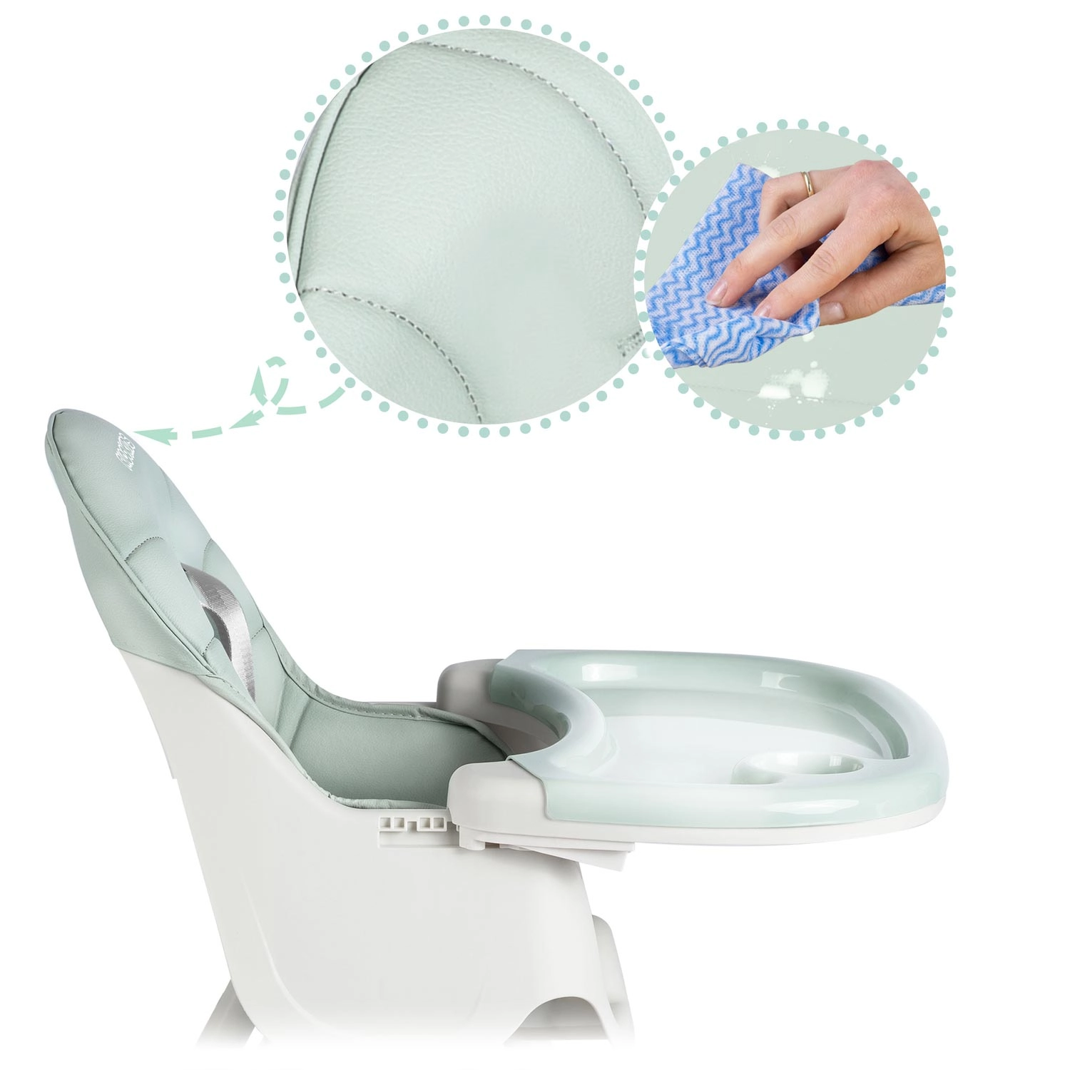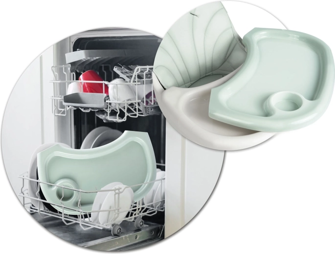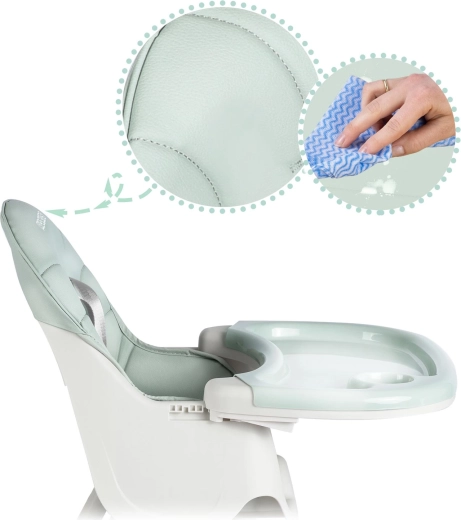 Pladanj s povišenim rubovima zadržava prolijevanja, uklonjivi umetak lako isperete ili operete u perilici posuđa. Sjedalo je dovoljno prebrisati vlažnom krpom.