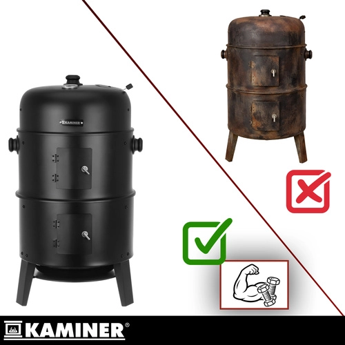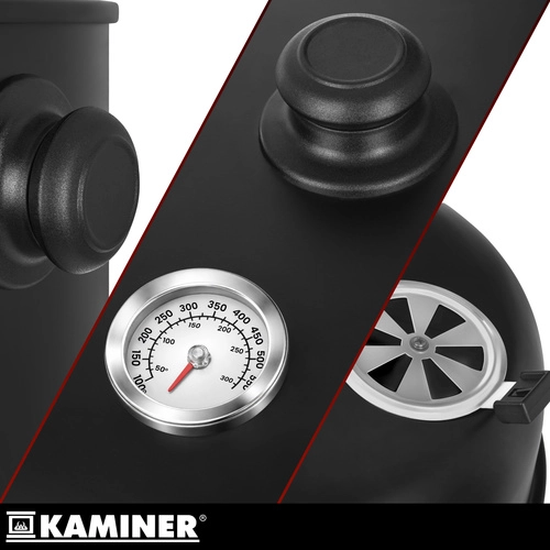 Otkrijte univerzalan KAMINER 3-u-1 koji kombinira roštiljanje, dimljenje i ognjište u jednom. Zahvaljujući termometru u poklopcu, regulaciji dotoka zraka i dvama kromiranim rešetkama promjera 38 cm pripremit ćete sočne odreske i mirisne kobasice uz minimalan trud. 8 kuka za dimljenje, izdržljiva čelična konstrukcija 0,9 mm i jednostavno čišćenje čine ga idealnim izborom za svaki BBQ.