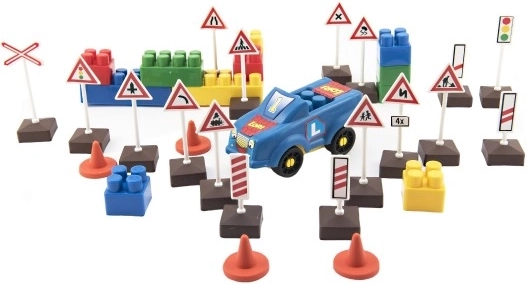 Građevinski set Autoškola nudi zabavu i učenje u jednom! Sadrži 16 komada prometnih znakova, 2 čunja i automobil, što je idealno za razvoj dječjih vještina.