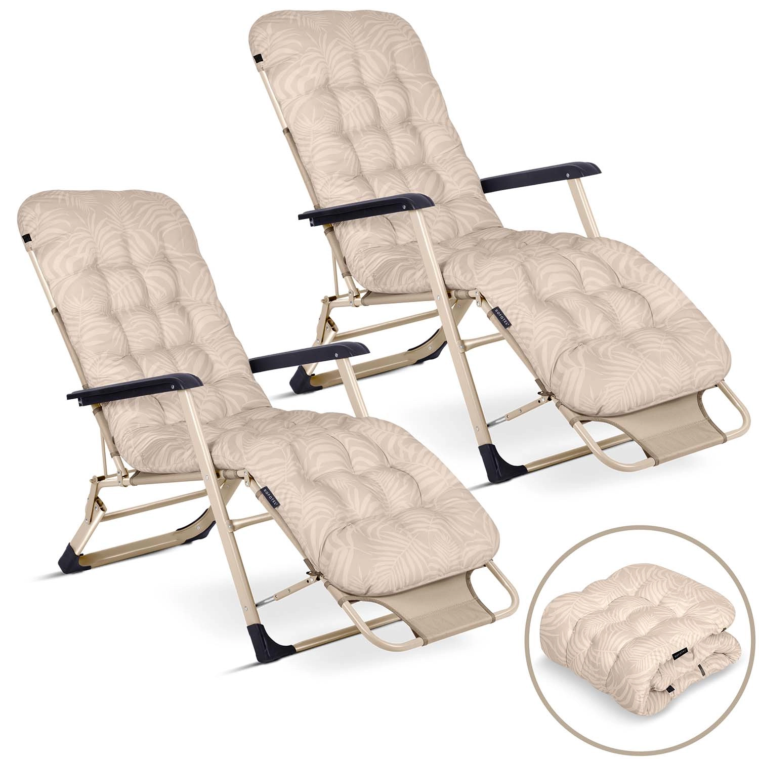 Robustan okvir s nosivošću 120 kg stabilan je i otporan na UV zračenje i temperaturne oscilacije. Nasloni za ruke od izdržljive plastike povećavaju udobnost, a protuklizne kapice na nogama osiguravaju sigurnost na raznim podlogama. Nakon sklapanja ležaljke zauzimaju minimum prostora i lako stanu u prtljažnik – idealno za odmor, uz bazen ili na plaži.