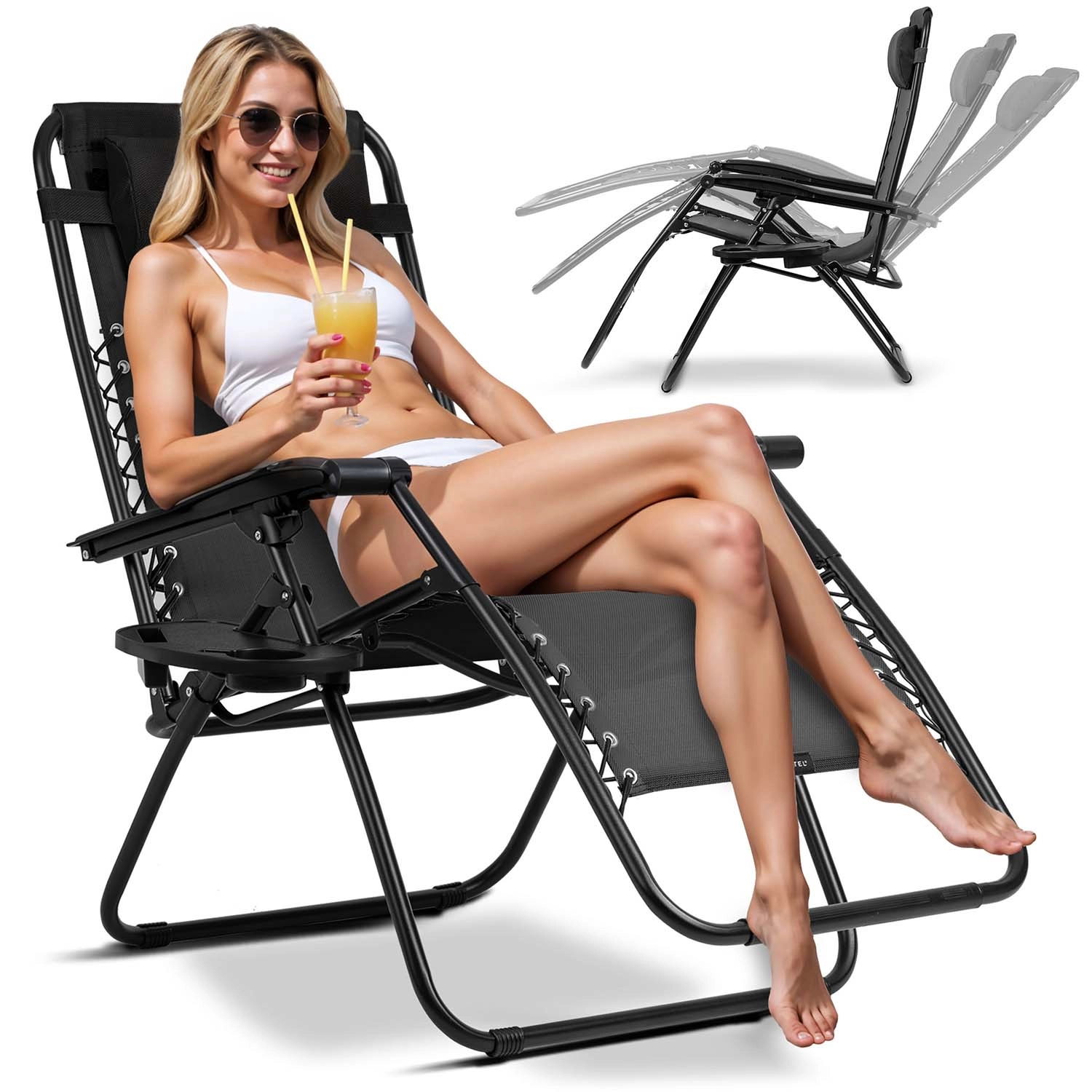 Promišljeni detalji povećavaju udobnost pri svakom sjedenju: odvojivi jastuk stabilno podupire glavu i vrat, bočni odlagalni stolić sigurno prima piće, telefon ili sitnice, a čvrsti nasloni za ruke olakšavaju promjenu položaja. Konstrukcija od čelika s praškastim premazom stabilna je i otporna na koroziju, dok je materijal textilene otporan na UV zračenje i vlagu.