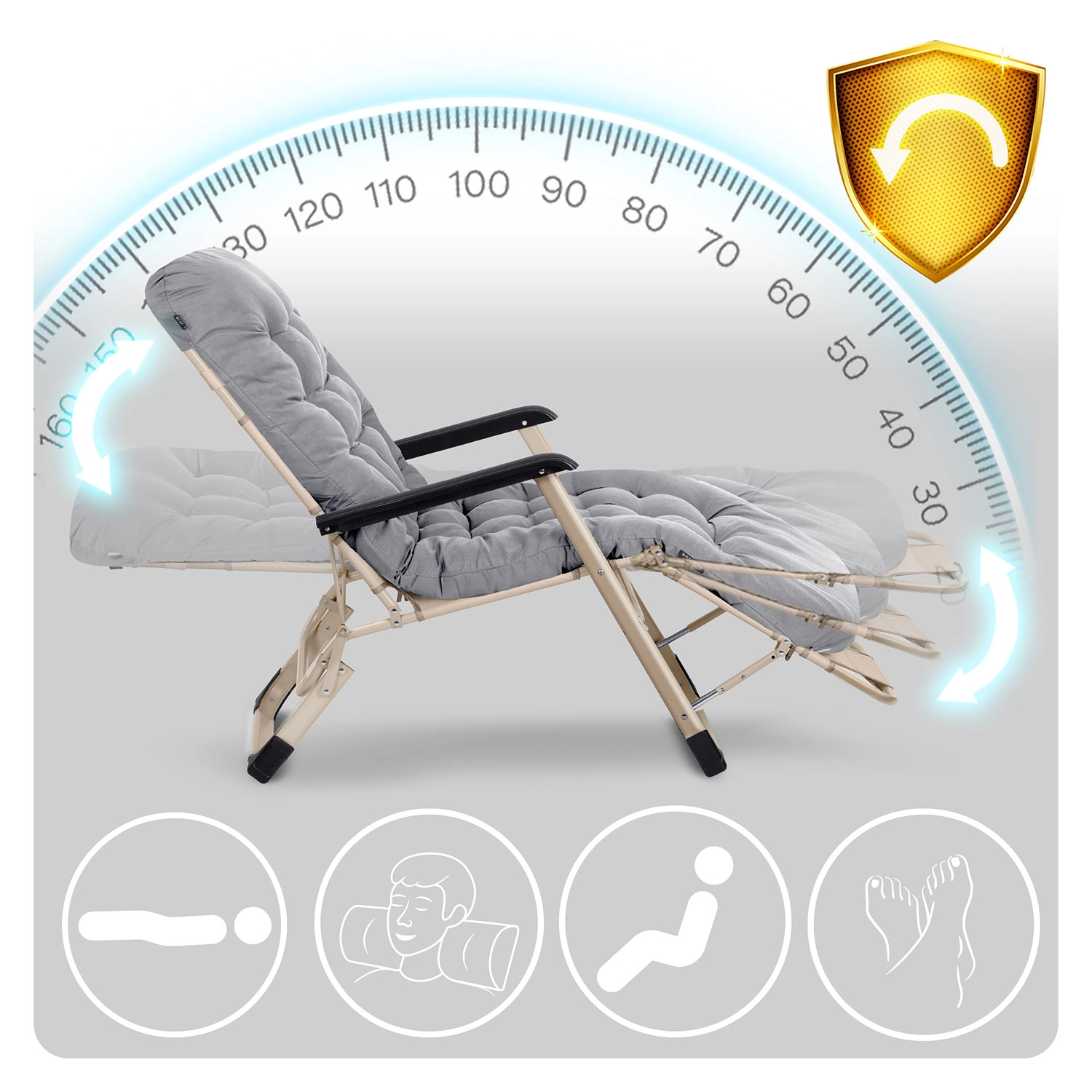 Glatko podesite naslon i iskoristite 3 stupnja podnožja. Ležeći položaj rasterećuje kralježnicu i poboljšava cirkulaciju zahvaljujući podignutim nogama.