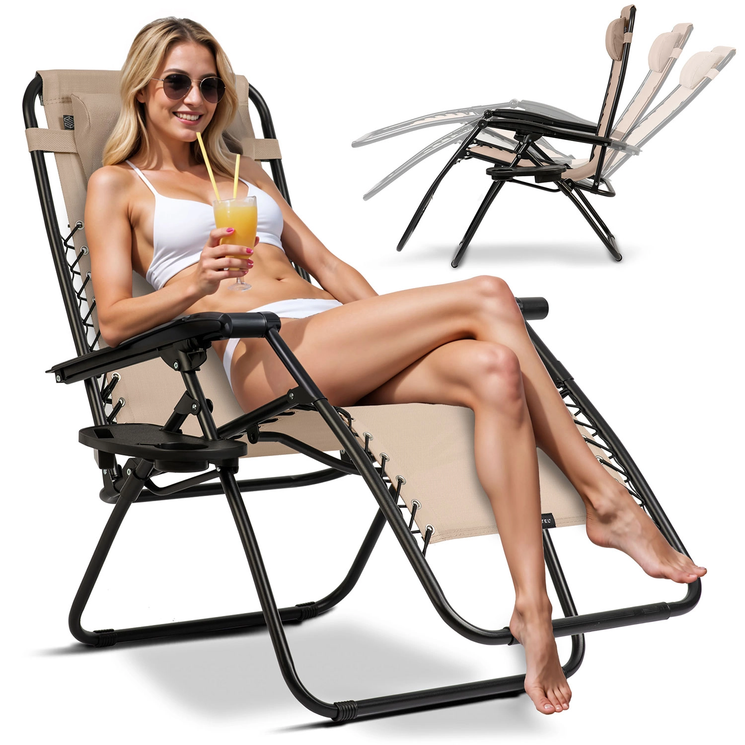 Uživajte u savršenom odmorU sa sklopivom ležaljkom Sofotel ChillWell u elegantnoj bež boji. Nudi udoban položaj nulte gravitacije, podesiv nagib naslona, odvojivi jastuk za glavu i vrat te praktičan bočni stolić s držačima za napitke i telefonom. Izdržljiva tekstilna tkanina i čvrst čelični okvir osiguravaju stabilnost i dug vijek trajanja kod kuće na terasi, u vrtu i na putovanjima.