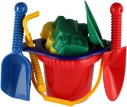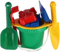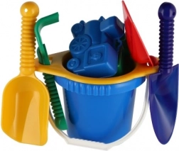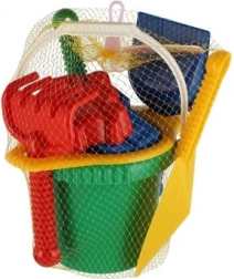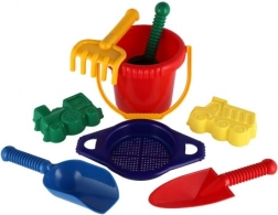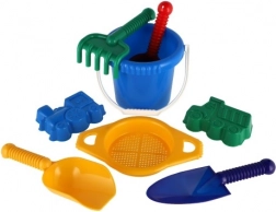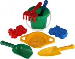 Sadrži sve potrebne alate za gradnju i kreativnu igru na pijesku - kantica, sita, lopatice, grabljice i dva kalupa.