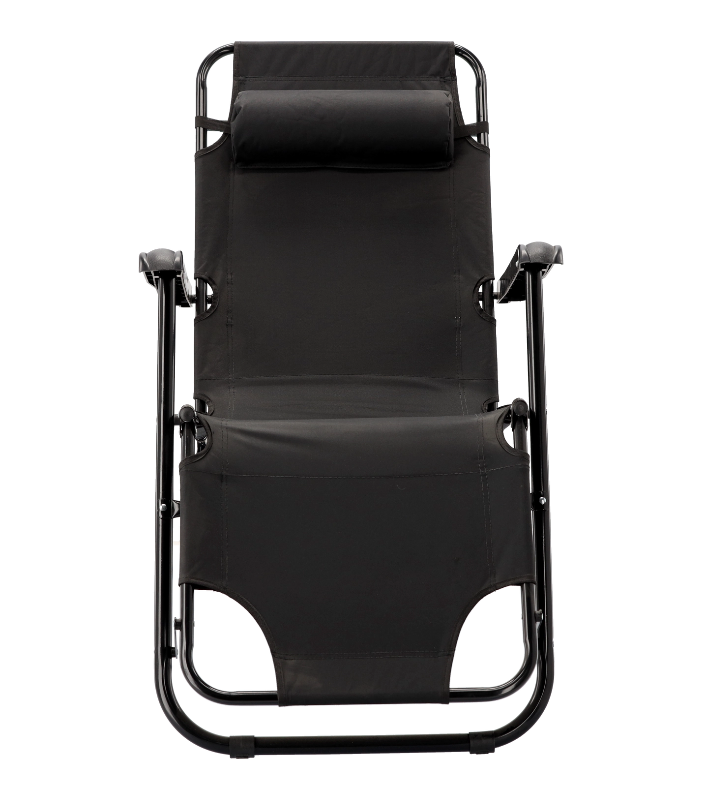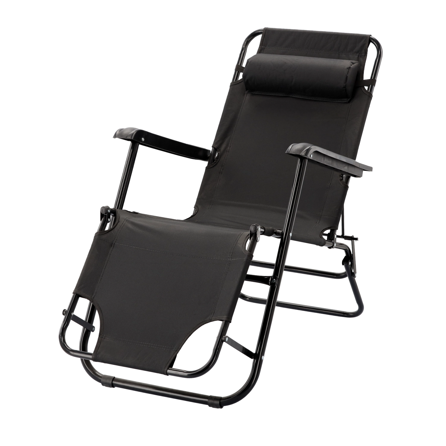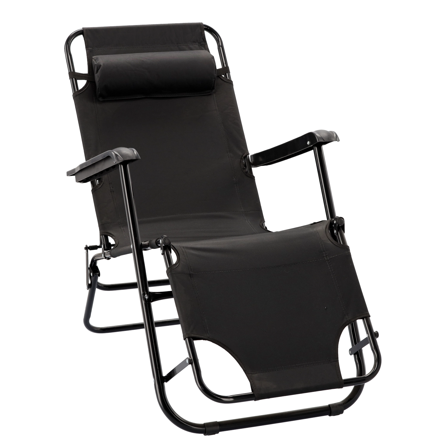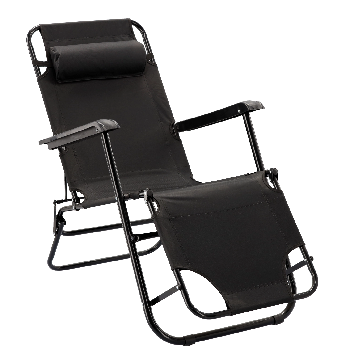 Praktična sklopiva vrtna ležaljka u elegantnoj crnoj boji idealna je za terasu, vrt i putovanja. Zahvaljujući metalnoj konstrukciji s praškastim premazom stabilna je i izdržljiva, dok prozračna tkanina pruža ugodnu udobnost i u vrućim danima. Jastučić za glavu lako je podesiti ili skinuti.