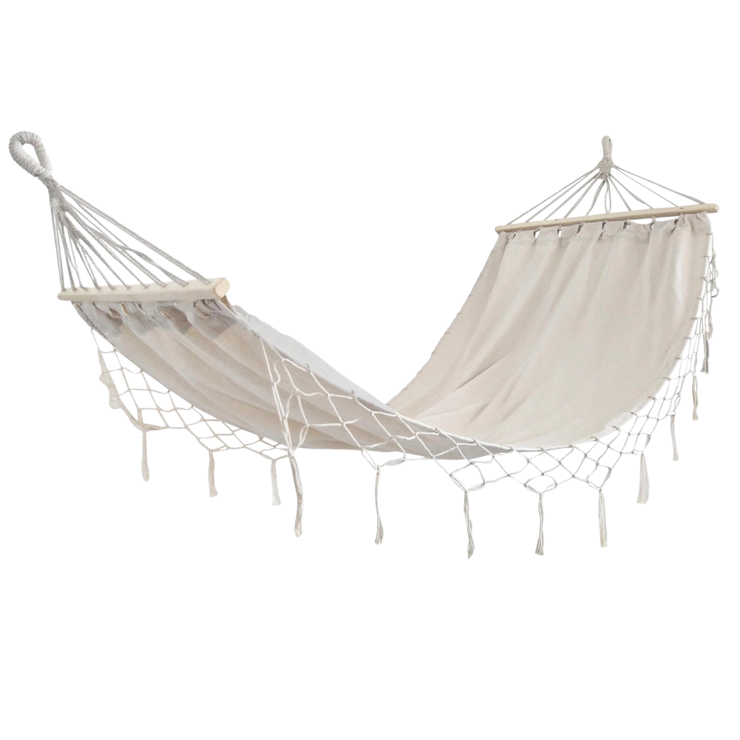 Ova bež viseća mreža s resama savršen je spoj dizajna i funkcionalnosti. Prirodna nijansa lako se usklađuje s vanjskim namještajem i interijerom, dok drvene razuporne letvice održavaju ležnu površinu udobno otvorenom za čitanje, odmor ili kratko drijemanje.