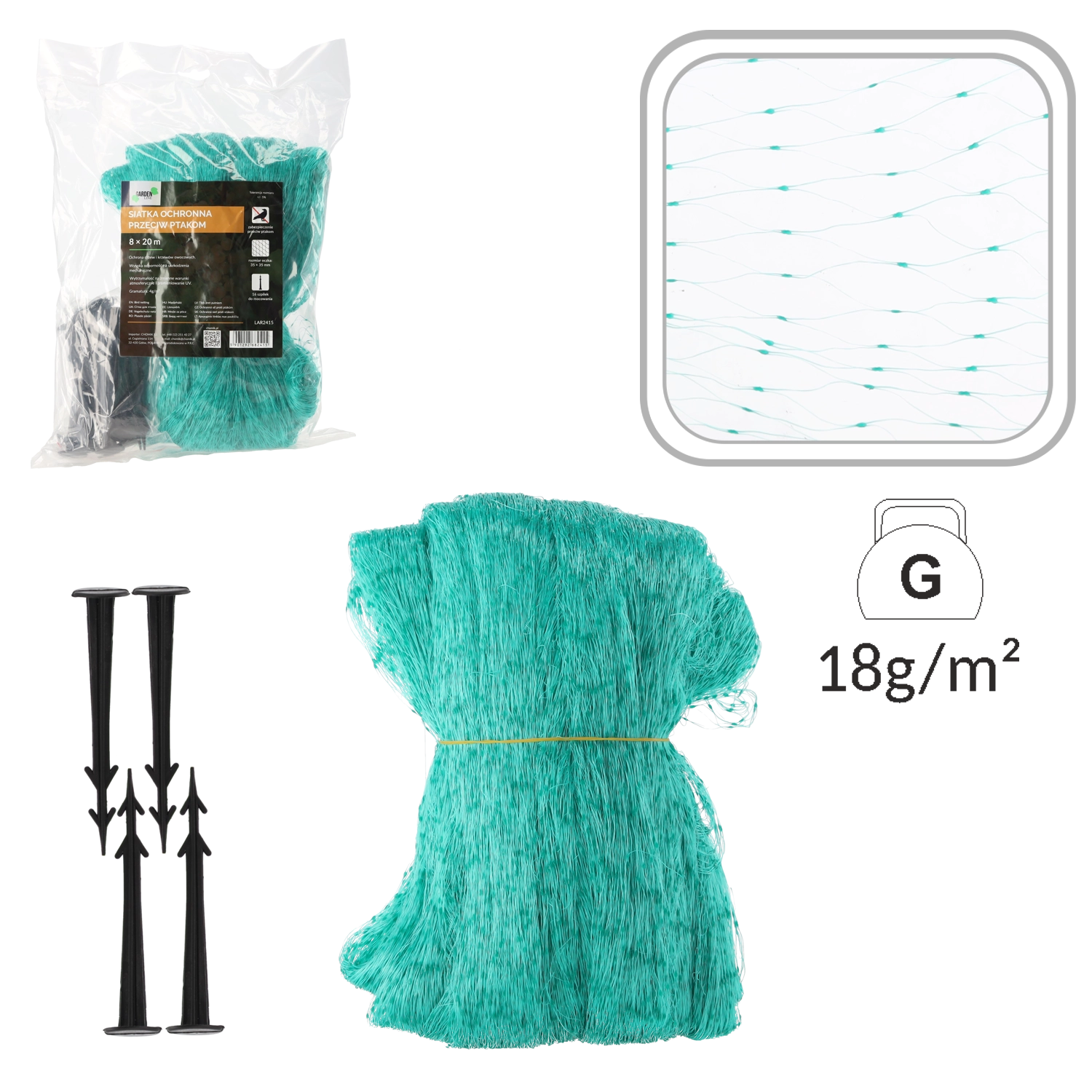 Izdržljiv polipropilen jamči dug vijek trajanja i mogućnost korištenja kroz više sezona. Okca 35 × 35 mm učinkovito sprječavaju prodor ptica, a istovremeno omogućuju biljkama disanje te propuštaju svjetlo i kišu. Ugradnja je brza i jednostavna – s 16 pričvrsnih klinova mrežu čvrsto osiguravate za tlo ili konstrukciju.