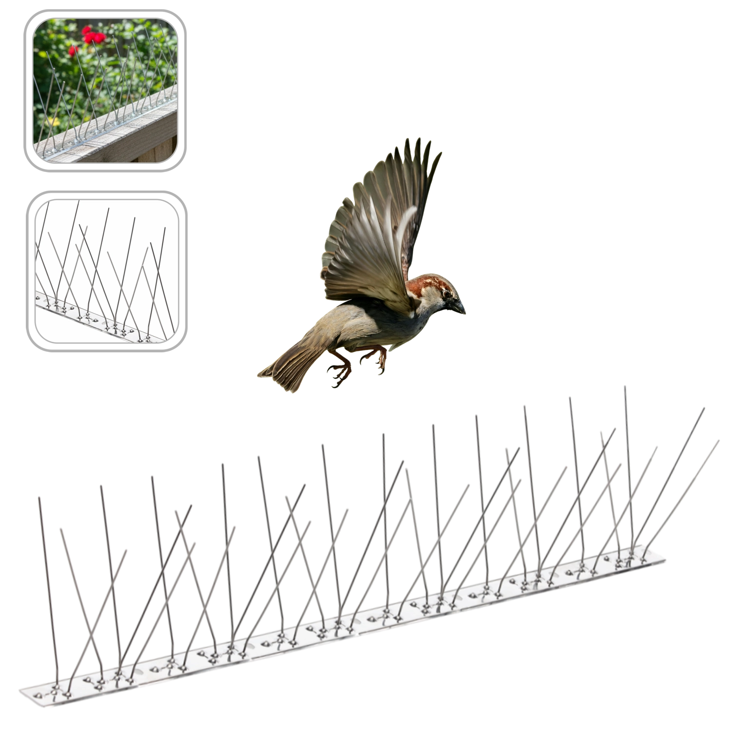 Praktični šiljci protiv ptica predstavljaju neinvazivan i human način sprječavanja slijetanja i gniježđenja ptica na izloženim mjestima. Zahvaljujući uskoj osnovi prikladni su za prozorske daske, vijence, oluke, ograde i nadstrešnice te pomažu održati vaše površine čistima, bez izmeta i nečistoća.