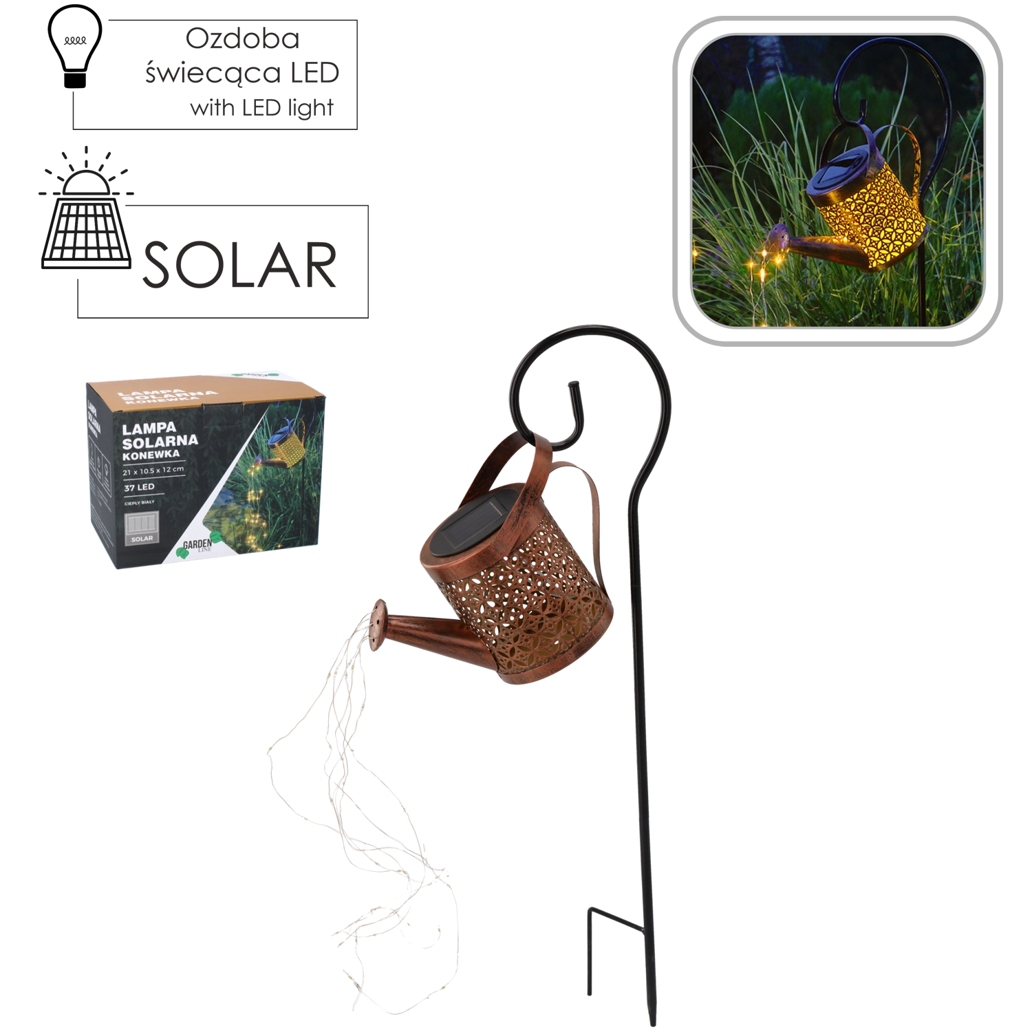 Svjetiljka nudi 37 LED u toploj bijeloj boji, koje nakon punog punjenja svijetle približno 6–7 sati. U kompletu je punjivi NI-MH akumulator, zaštita IP44 protiv prskajuće vode i praktična kuka na zabodivom visećem stalku ukupne visine oko 80 cm. Kompaktna zalijevača (21 × 10,5 × 12 cm) lako se postavlja u gredice, uz jezerca ili na terasu.