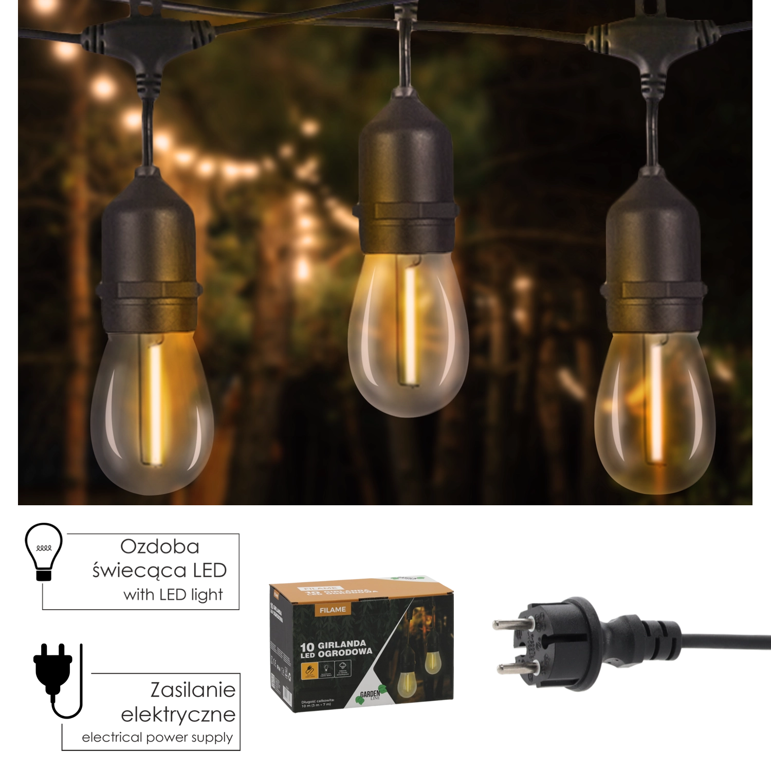 Zahvaljujući zaštiti IP44 girlanda je otporna na vlagu i vremenske uvjete. LED žarulje E27 (1 W/kom) štede energiju, a istovremeno pružaju efektan vintage izgled s filament stilom. Razmak 0,7 m između grla osigurava ravnomjernu raspodjelu svjetla.