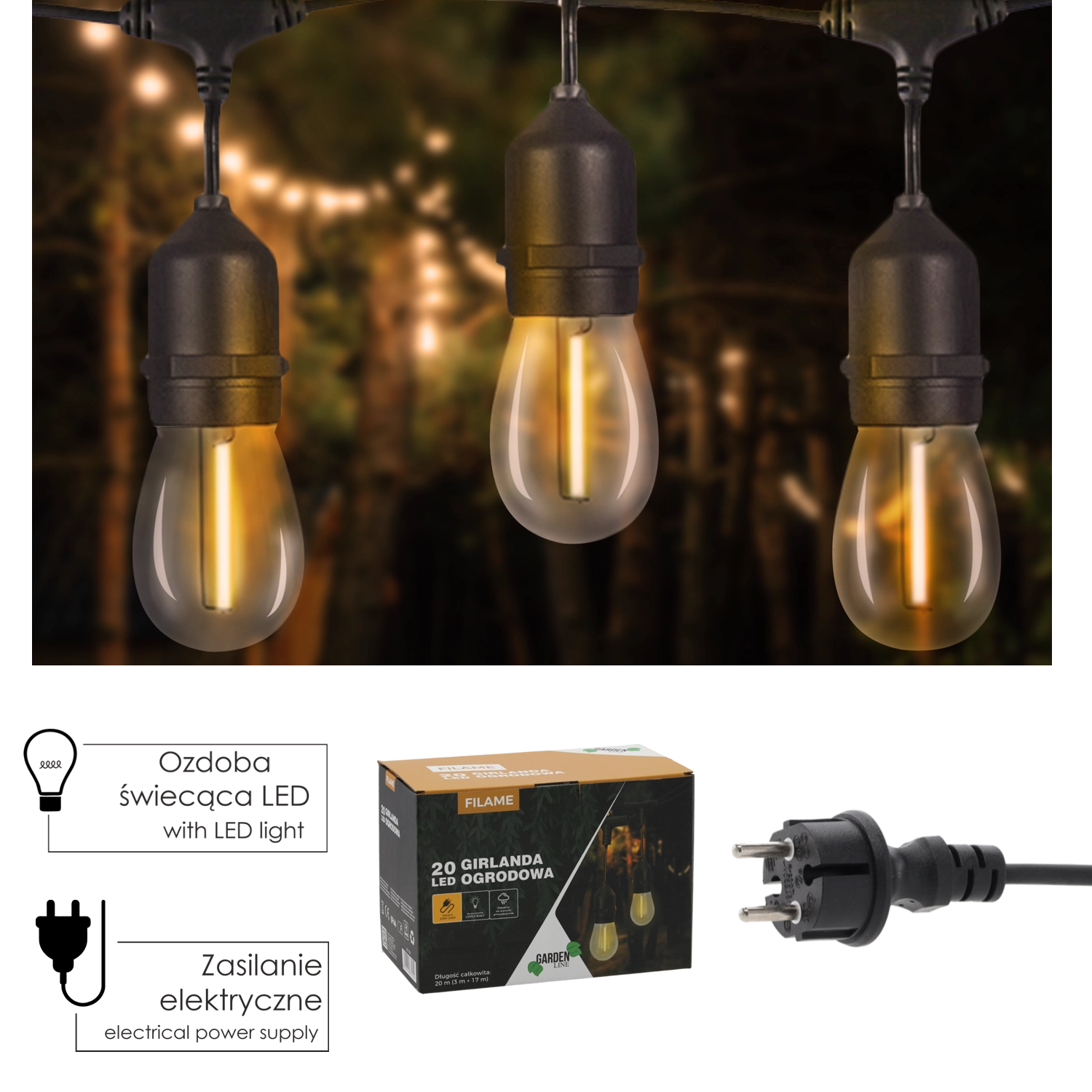 Stvorite čarobnu atmosferu u vrtu, na terasi ili balkonu sa svjetlosnom girlandom duljine 20 m s 20 LED žarulja E27 u nijansi toplo bijele (3000 K). Zaštita IP44 omogućuje vanjsku uporabu, štedljive žarulje 1 W štede energiju, a mogućnost povezivanja više setova pokrit će i velike prostore.