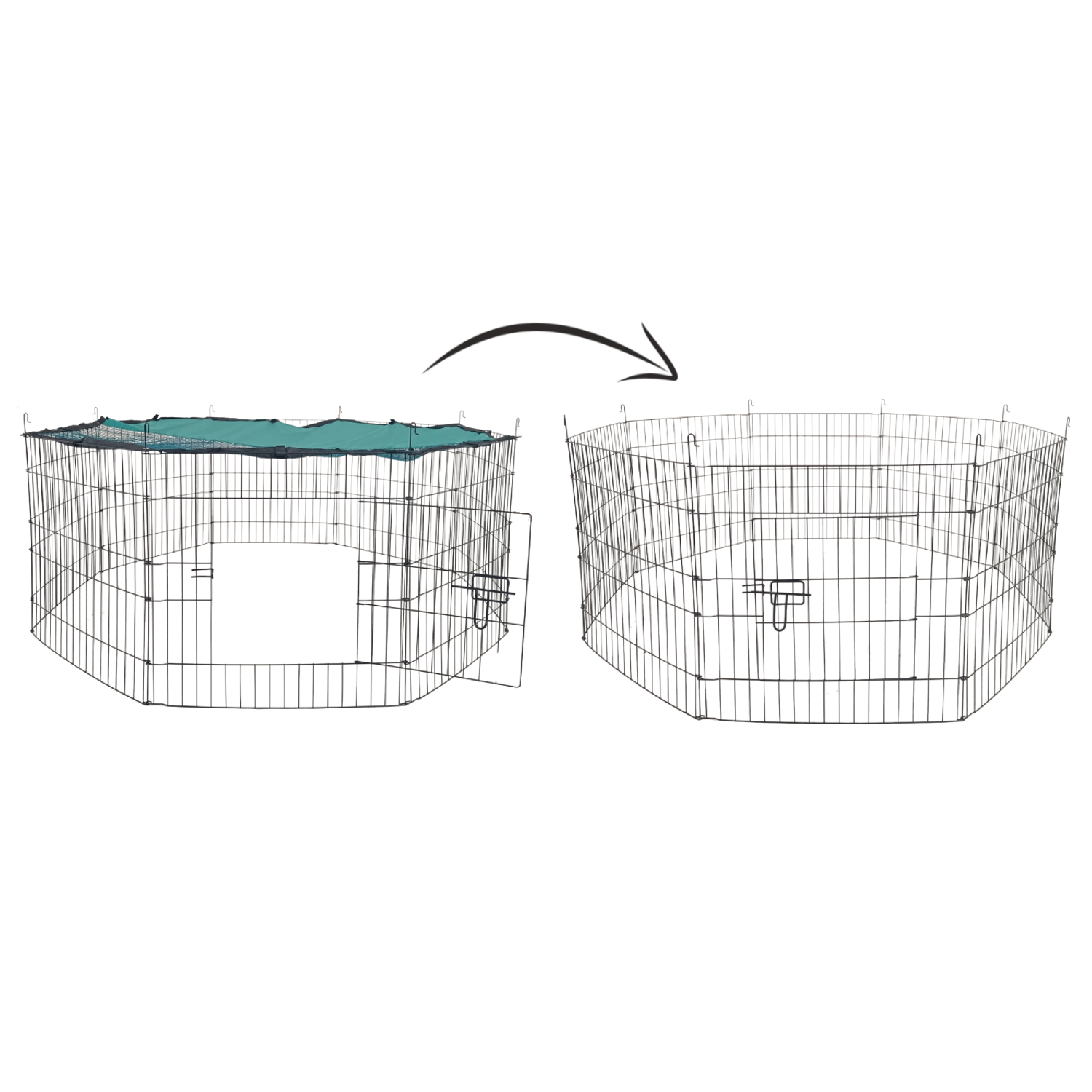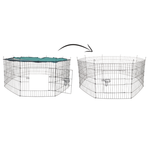 Praktična ograđiva za pse, mačke, kuniće i druge male životinje kombinira stabilnu čeličnu konstrukciju i zasjenjivaću mrežu za zaštitu od sunca. Zahvaljujući 8 panela dimenzija 56 × 57 cm lako možete prilagoditi oblik prostora. Jednostavna montaža/demontaža, izdržljiva izrada i kompaktne dimenzije idealni su za vrt, vikendicu i putovanja.