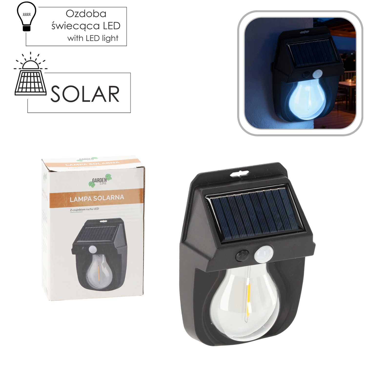 Zahvaljujući integriranom solarnom panelu 1 W / 5,5 V lampa se danju puni, a noću svijetli iz ugrađene Li-ion baterije 18650, 3,7 V, 800 mAh. Izvor svjetla čini 50× SMD 2835 LED, koje pružaju uravnoteženo i štedljivo osvjetljenje s približno 300 lm. Montaža je jednostavna i bez kabela – idealno za fasade, ograde ili nadstrešnice.