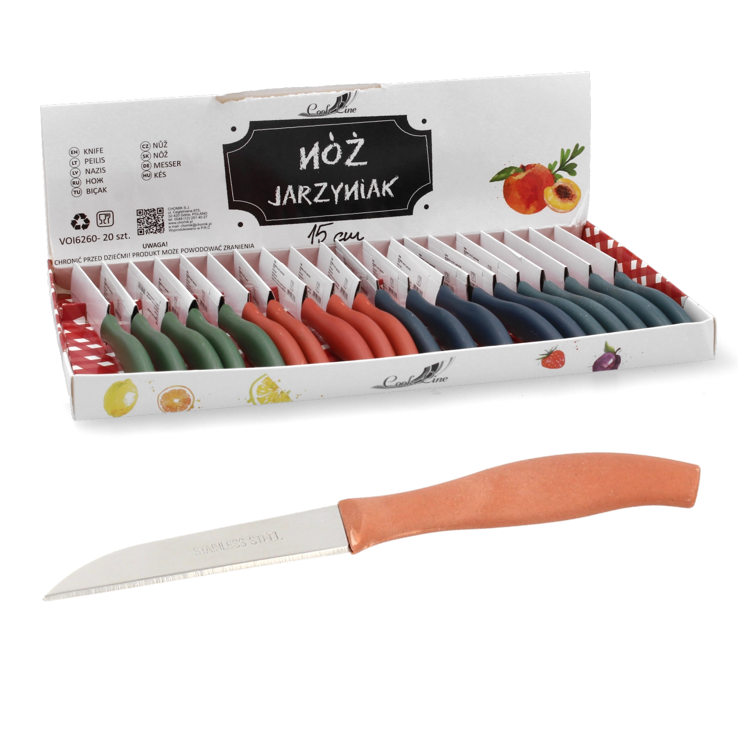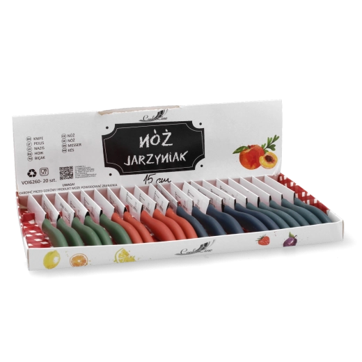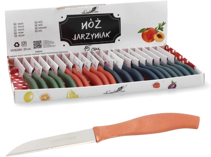 Praktičan nož za povrće s duljinom oštrice 15 cm za precizno rezanje voća i povrća. Ergonomska drška osigurava udobno korištenje, a u pakiranju je čak 20 komada – idealno za restorane, catering i kućanstva. Univerzalna duljina oštrice, pouzdan učinak i povoljno pakiranje za svakodnevni rad u kuhinji.