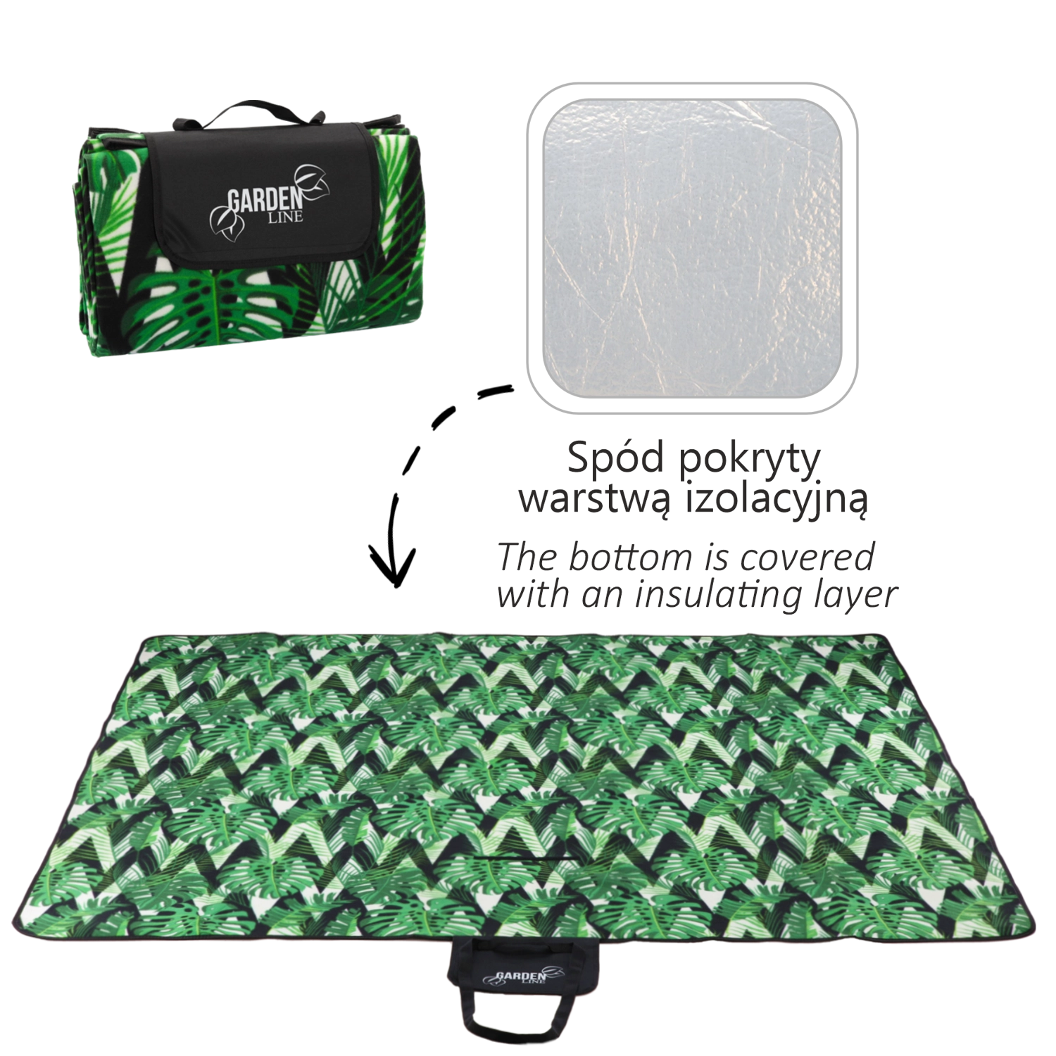 Uživajte u pikniku, izletu na vodu ili opuštanju u vrtu s dekom koja spaja udobnost i praktičnost. Gornja mekana tkanina ugodna je na dodir, srednji sloj od pjene ublažava neravnine terena, a donja izolacijska folija štiti od vlage i hladnoće. Tropski uzorak Monstera vašem će druženju dodati stil.