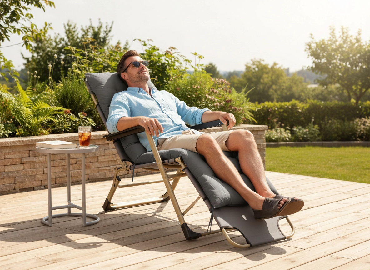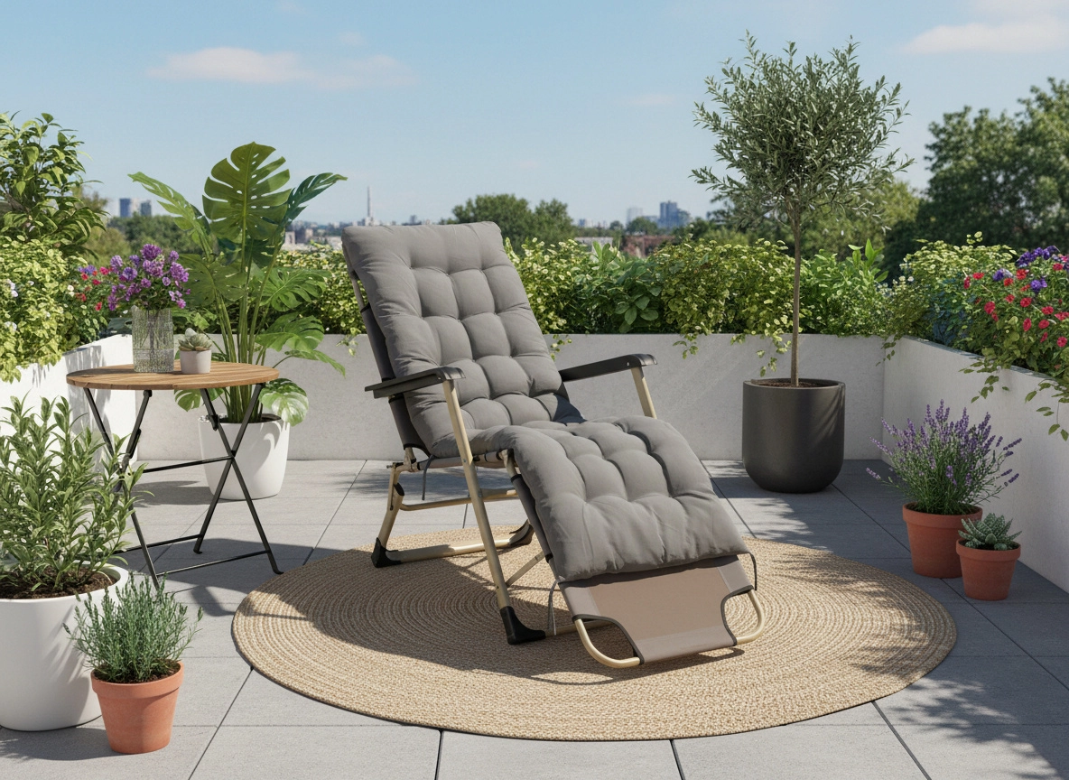 Uživajte u opuštanju na otvorenom i kod kuće sa sklopivom vrtnom stolicom s jastukom u elegantnoj sivoj boji. Laka metalna konstrukcija, mekana presvlaka i podesiv nagib osiguravaju udobnost pri čitanju, sunčanju i odmoru. Zahvaljujući sklopivom dizajnu lako je prenosite na terasu, balkon ili u kamp.