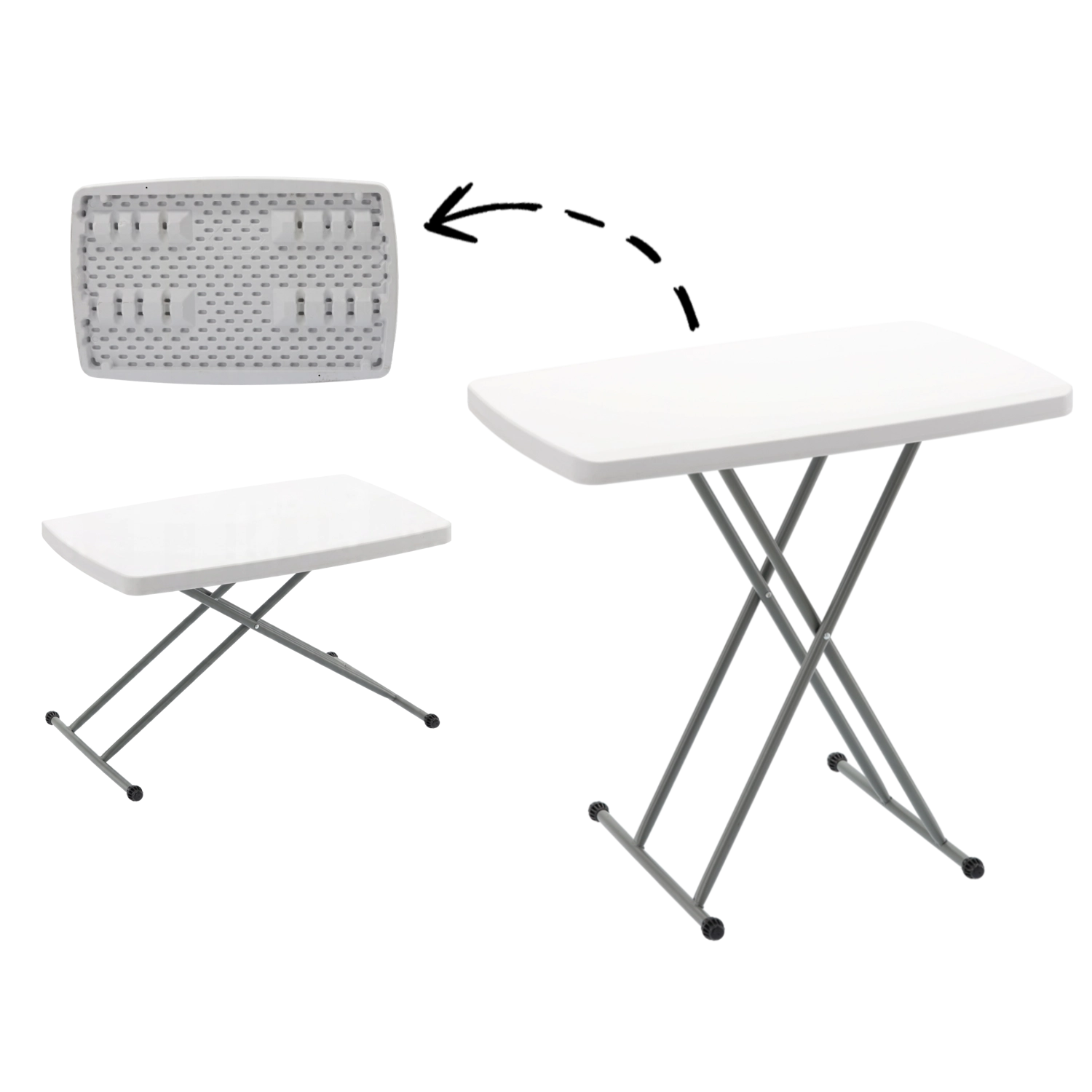 Zahvaljujući brzom sklapanju savršen je za kampiranje, putovanja kamperom, vrtna druženja i kućnu upotrebu kao pomoćni stolić ili radna površina. Izdržljiva bijela ploča lako se čisti i odlično izgleda u interijeru i eksterijeru.