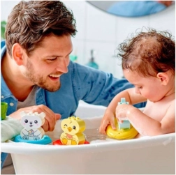 Hipopotamčić, pačić i polarni medo sjede na šarenim prstenovima koji glatko plutaju i mogu se spojiti u vlakić za još veću zabavu u kadi.