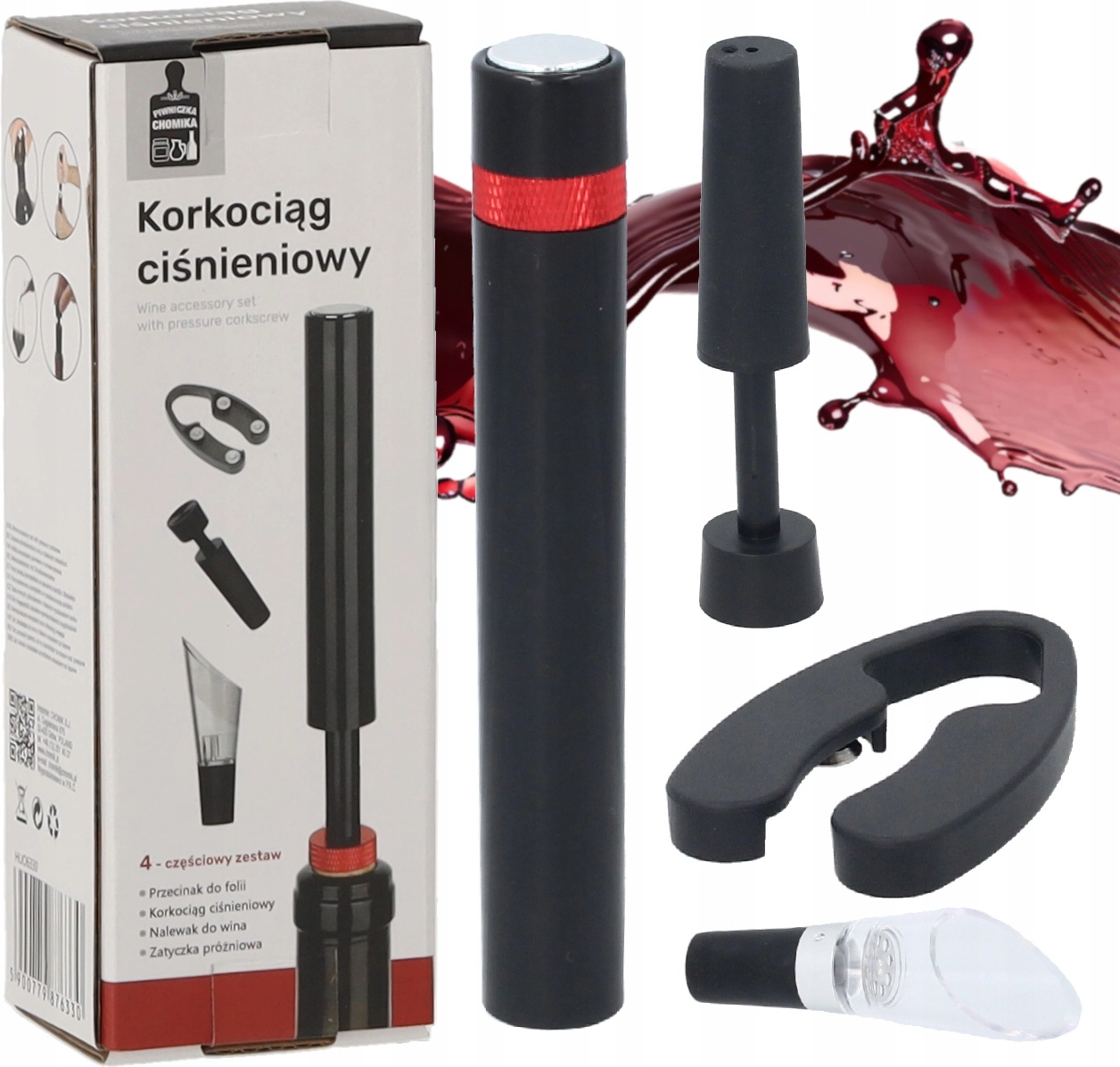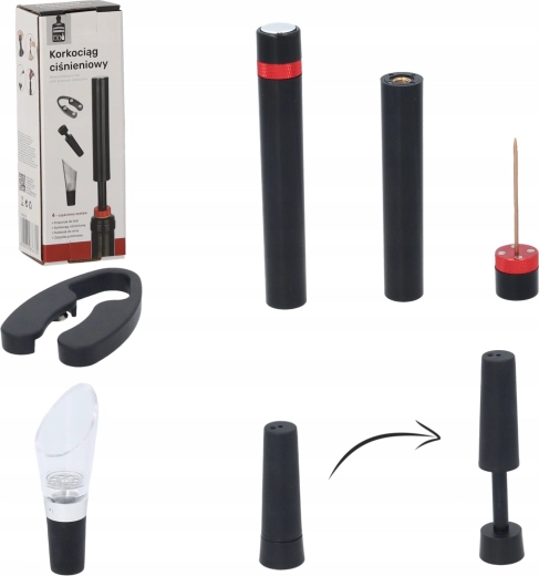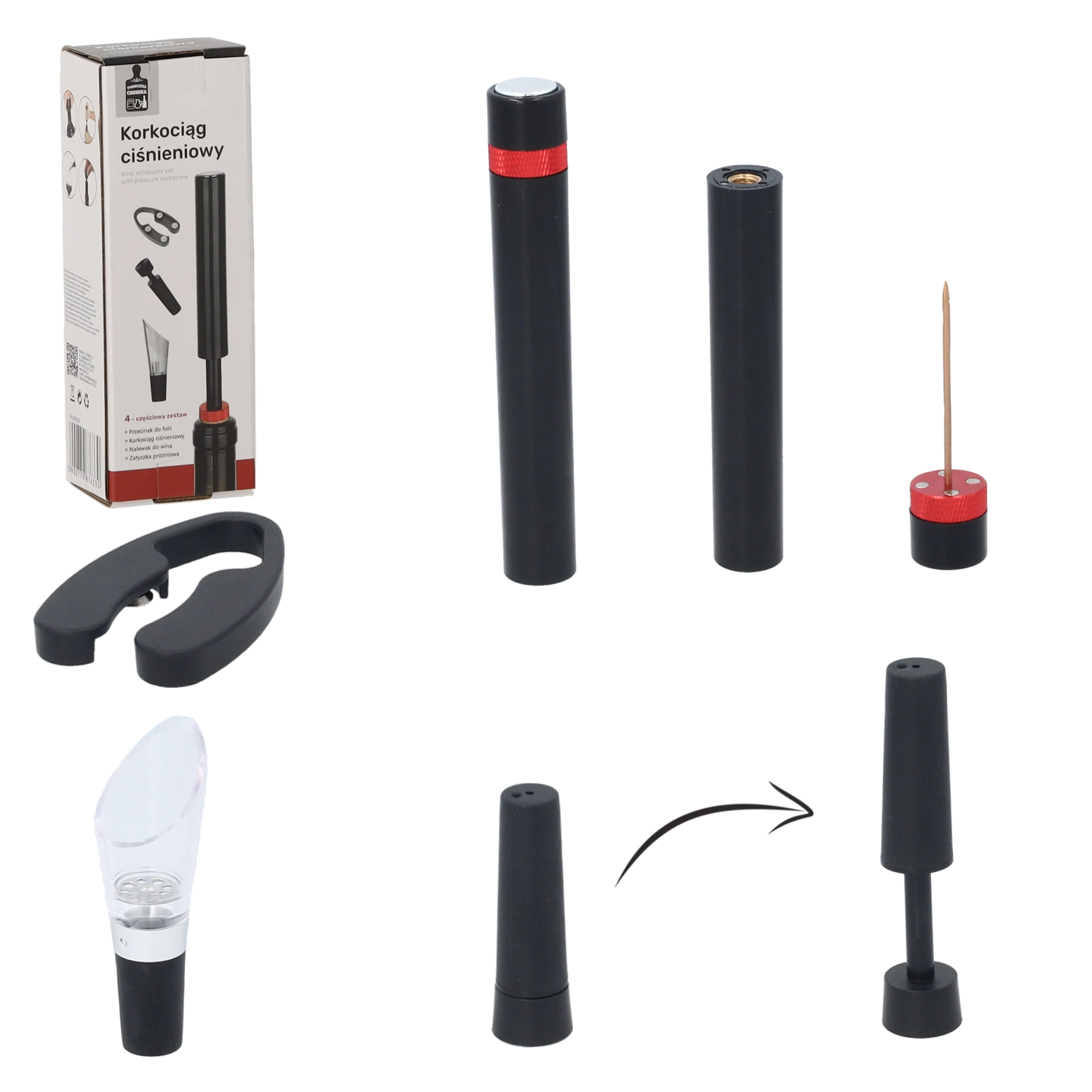 Elegantni poklon-set za ljubitelje vina sadrži sve što je potrebno za jednostavno otvaranje i posluživanje: tlačni vadičep, rezač folije, čep za bocu i nastavak za točenje s aeratorom. Kombinacija nehrđajućeg čelika i izdržljive plastike u crnoj izvedbi jamči dug vijek trajanja i moderan izgled.