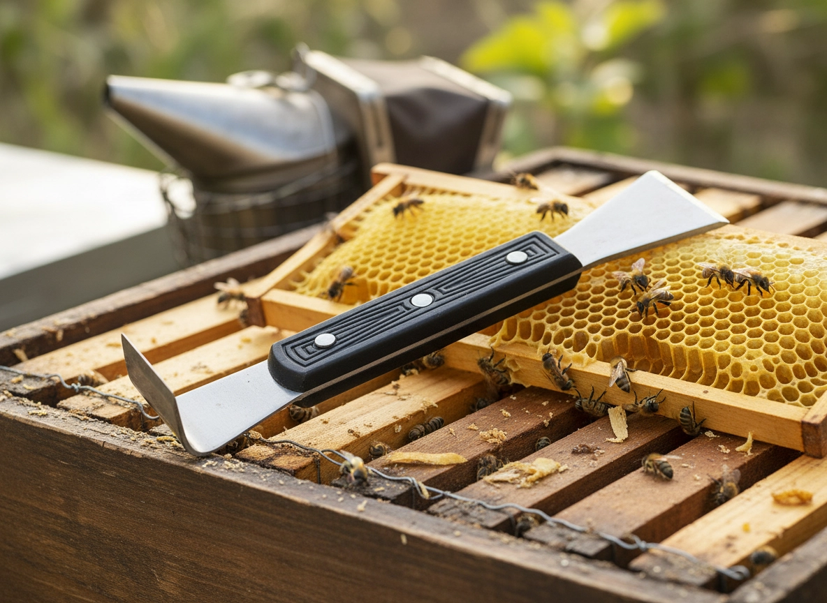 Posebno oblikovana kuka olakšava odvajanje zalijepljenih okvira, dok drugi kraj učinkovito struže vosak i propolis s površina košnice.