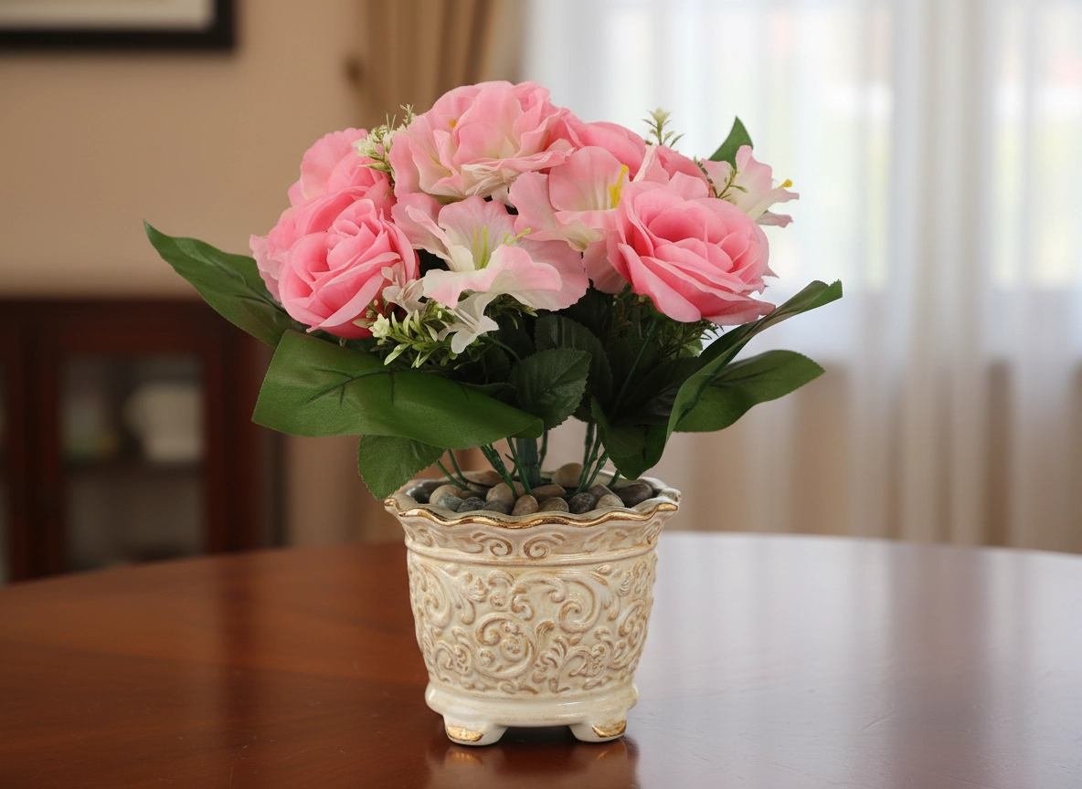 Detaljno izrađeni cvjetovi ruža i hibiskusa djeluju prirodno i zadržavaju svjež izgled cijele godine – bez zalijevanja i opadanja latica.