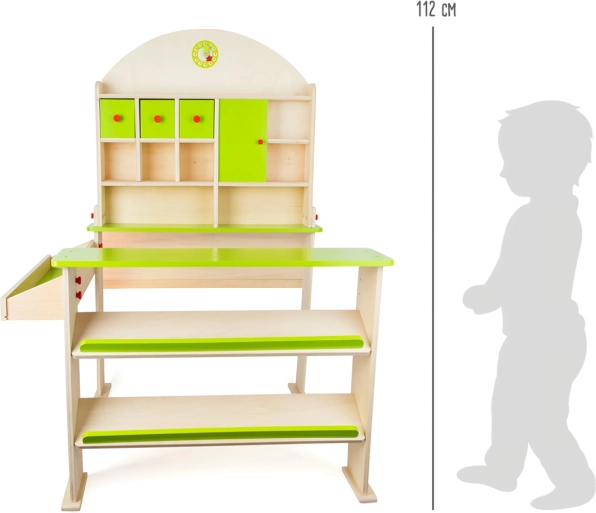 Moderni drveni prodajni štand ne samo da razvija komunikacijske i matematičke vještine djece, već i podržava njihovu kreativnost. Opremljen je prostorima za pohranu koji uključuju kose police za spremanje kutija i samostalne police za makete i proizvode. Stražnji zid sadrži odlagališne površine i ormare s funkcionalnim vratima. Na vrhu štanda su satovi koje djeca mogu koristiti za učenje vremena i označavanje radnog vremena.