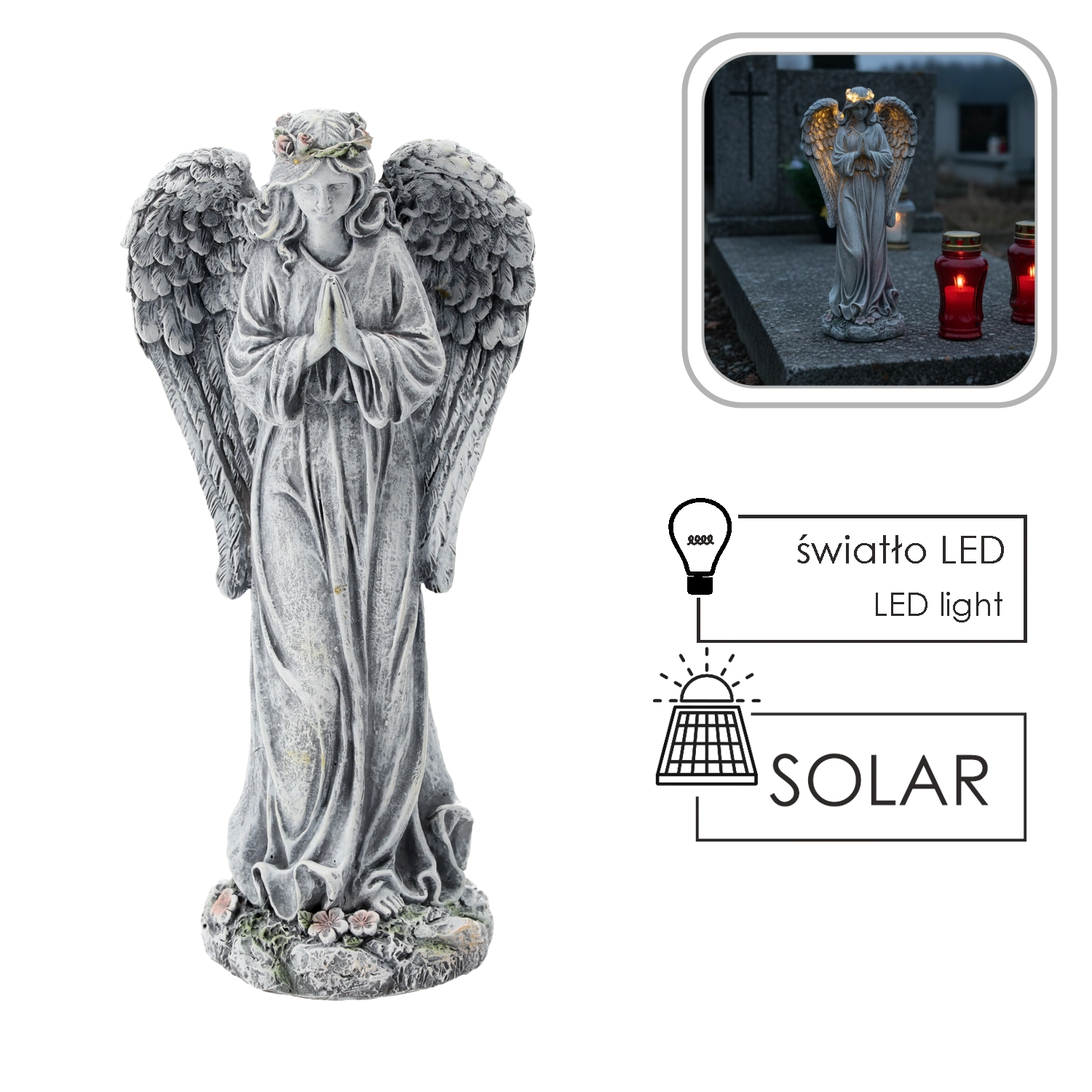 Elegantna anđeoska figurica u nježnoj sivoj boji s vijencem osvijetljenim LED stvara umirujuću i duhovnu atmosferu. Zahvaljujući solarnom napajanju svijetli ekološki i bez potrebe za održavanjem, idealna za groblja, memorijalna mjesta i kućne dekoracije.